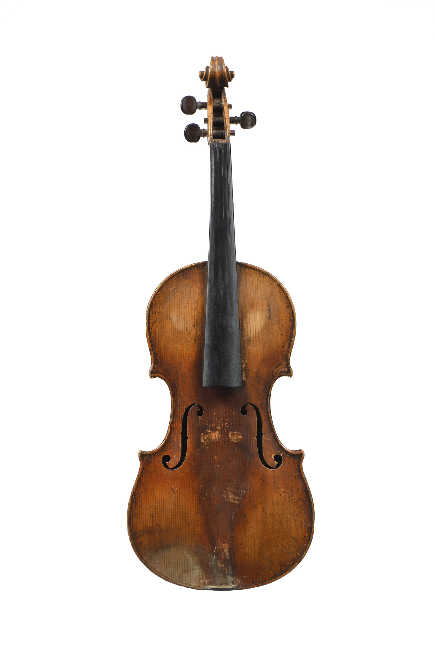 Fond de deux pièces en érable. Vernis brun orangé sur fond doré. Avec boite et archet en l'état (cassé a la tête). 359 mm. Traces de vers aux éclisses.