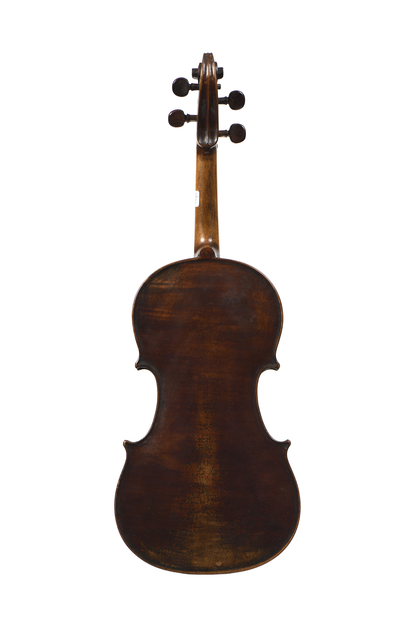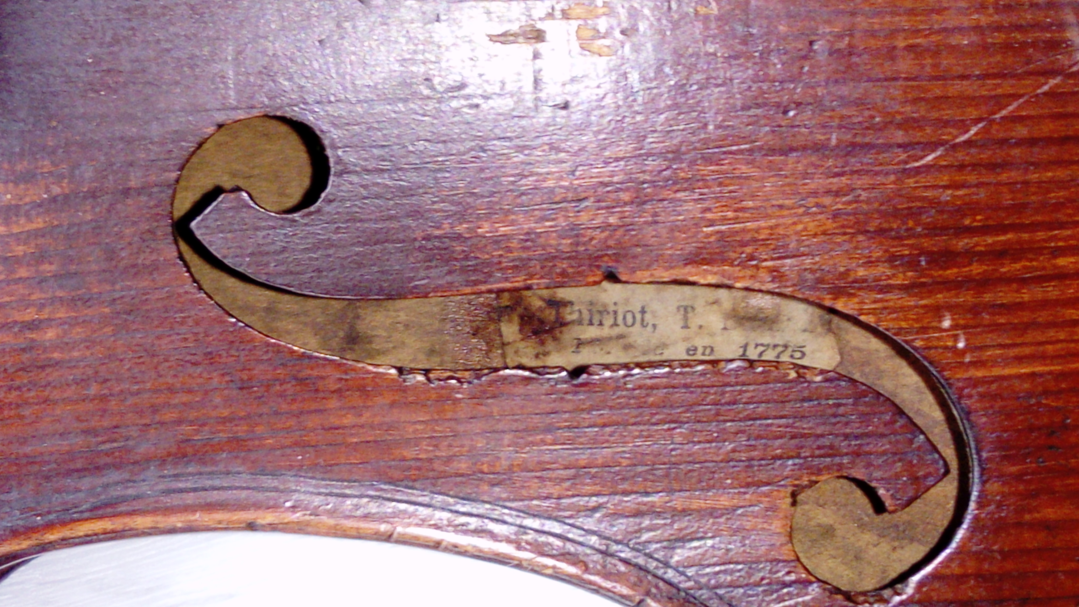 portant une étiquette abimée "Thiriot, T. en 1775...". Fond d'une pièce en érable. Vernis brun sur fond doré. Avec boite et archet. Non fileté. 357 mm.