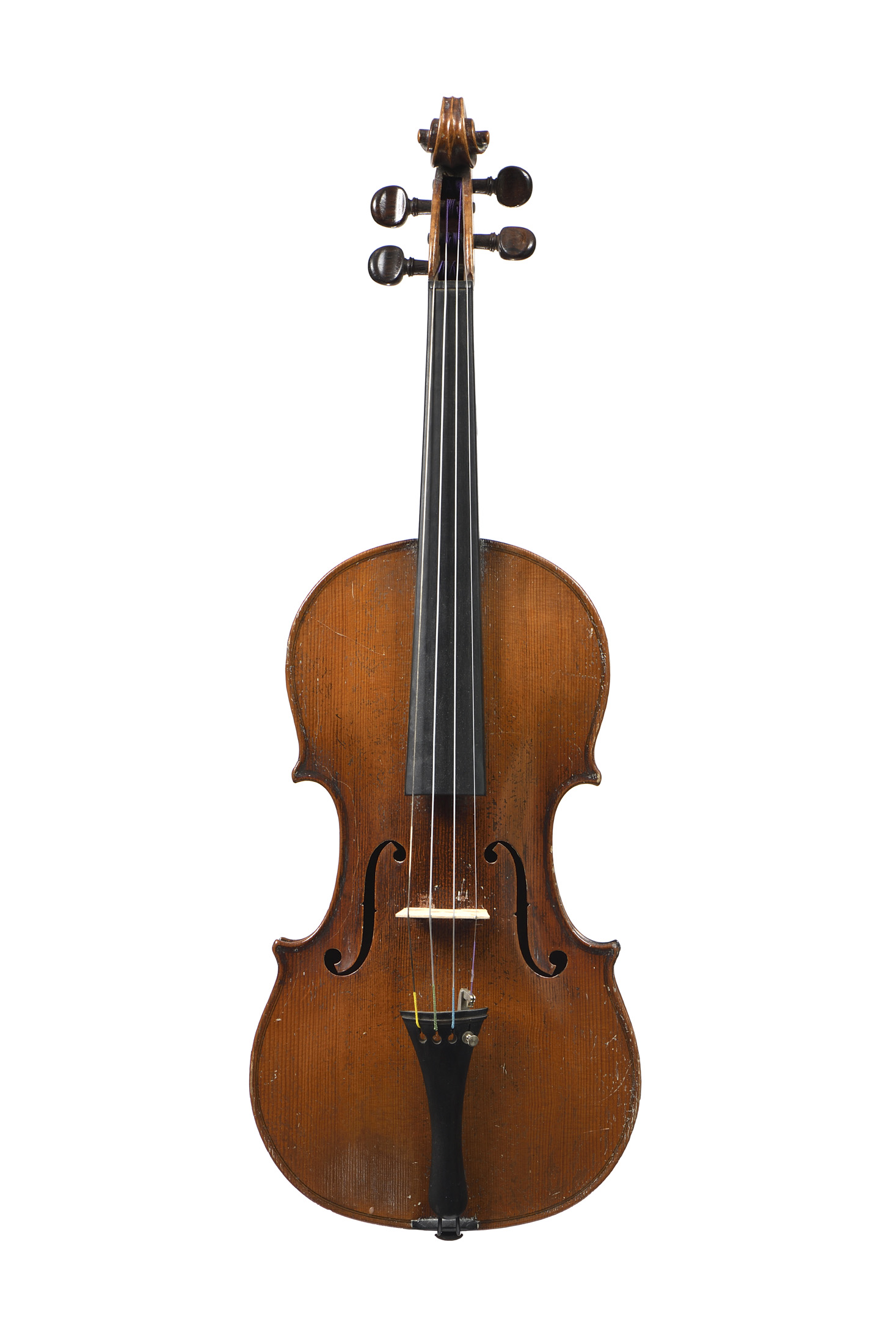 portant une étiquette "Copie de Nicolaus Amatus... 1676.". Fond de deux pièce en érable. Vernis brun sur fond doré. Avec boite et deux archets. 359 mm.