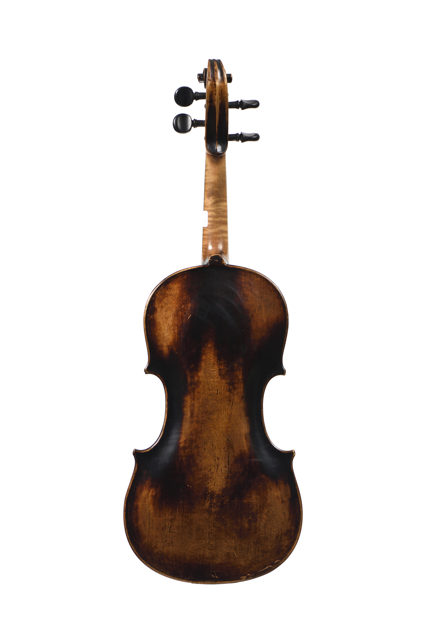portant une étiquette "David Techler... 1703.". Fond d'une pièce. Vernis brun foncé sur fond doré. 356 mm. Avec boite et deux archets.