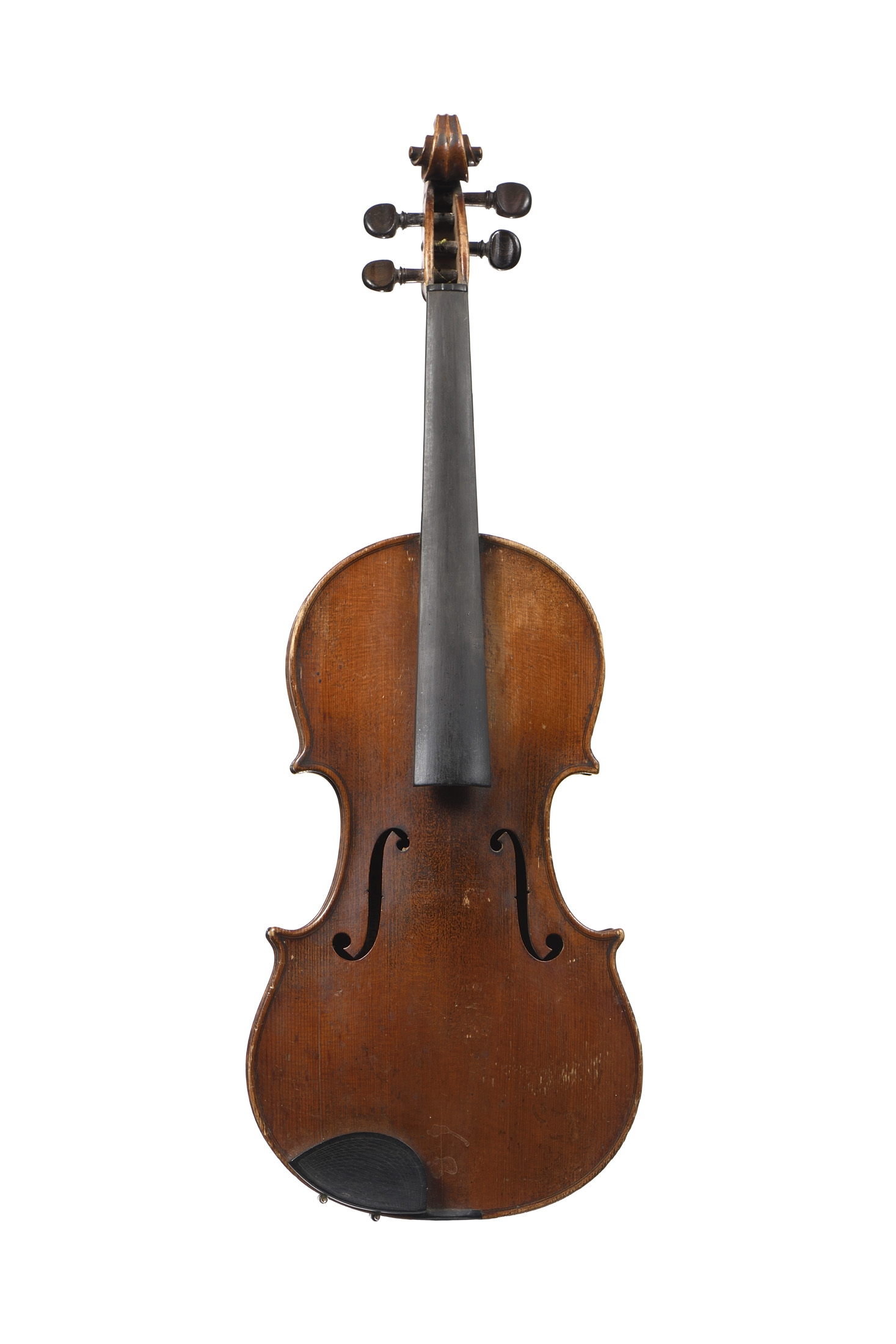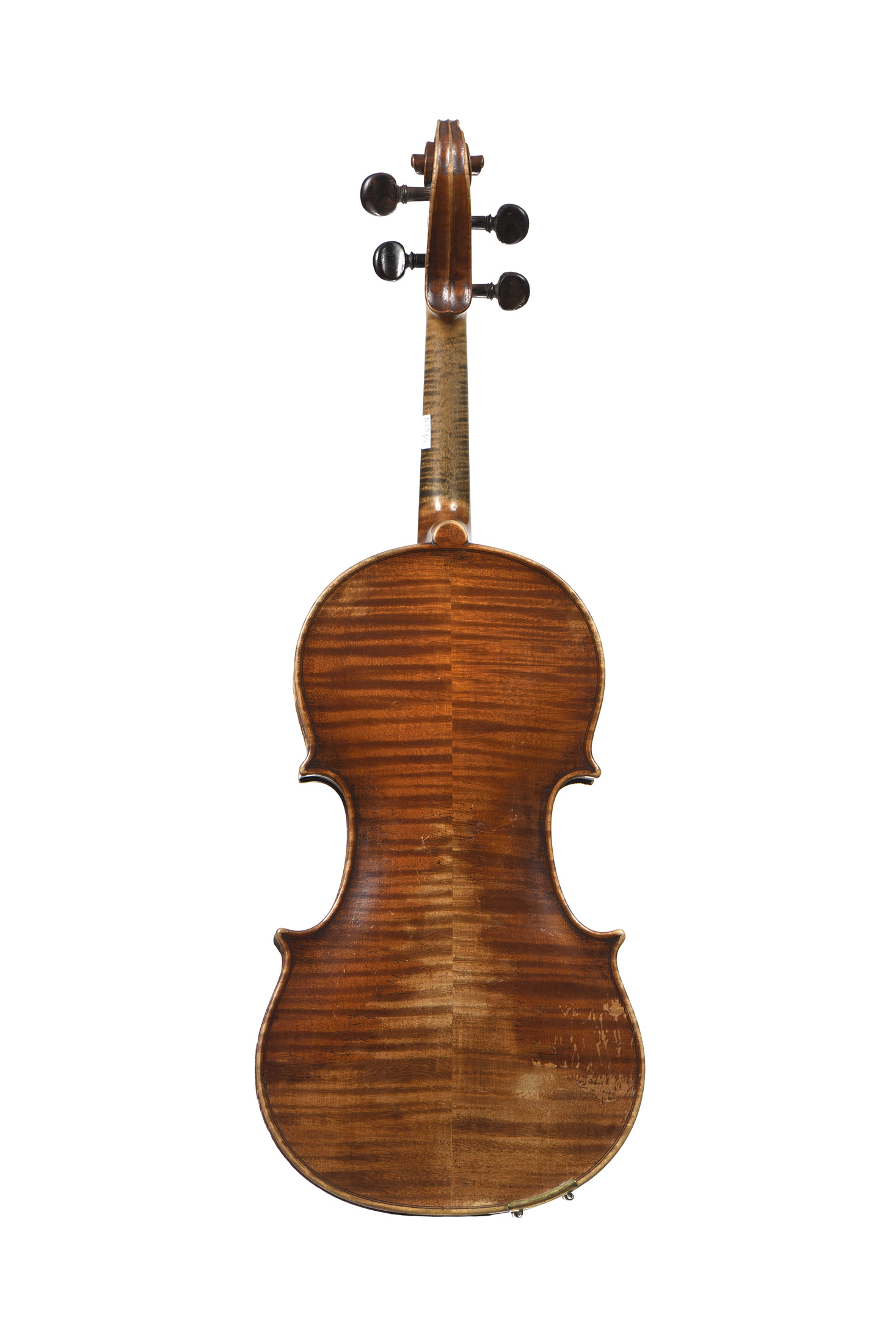 portant une étiquette "Copie de Antonius Stradivarius 1721". Fond de deux pièces en érable. Vernis brun sur fond doré. Avec boite et archet. 360 mm.