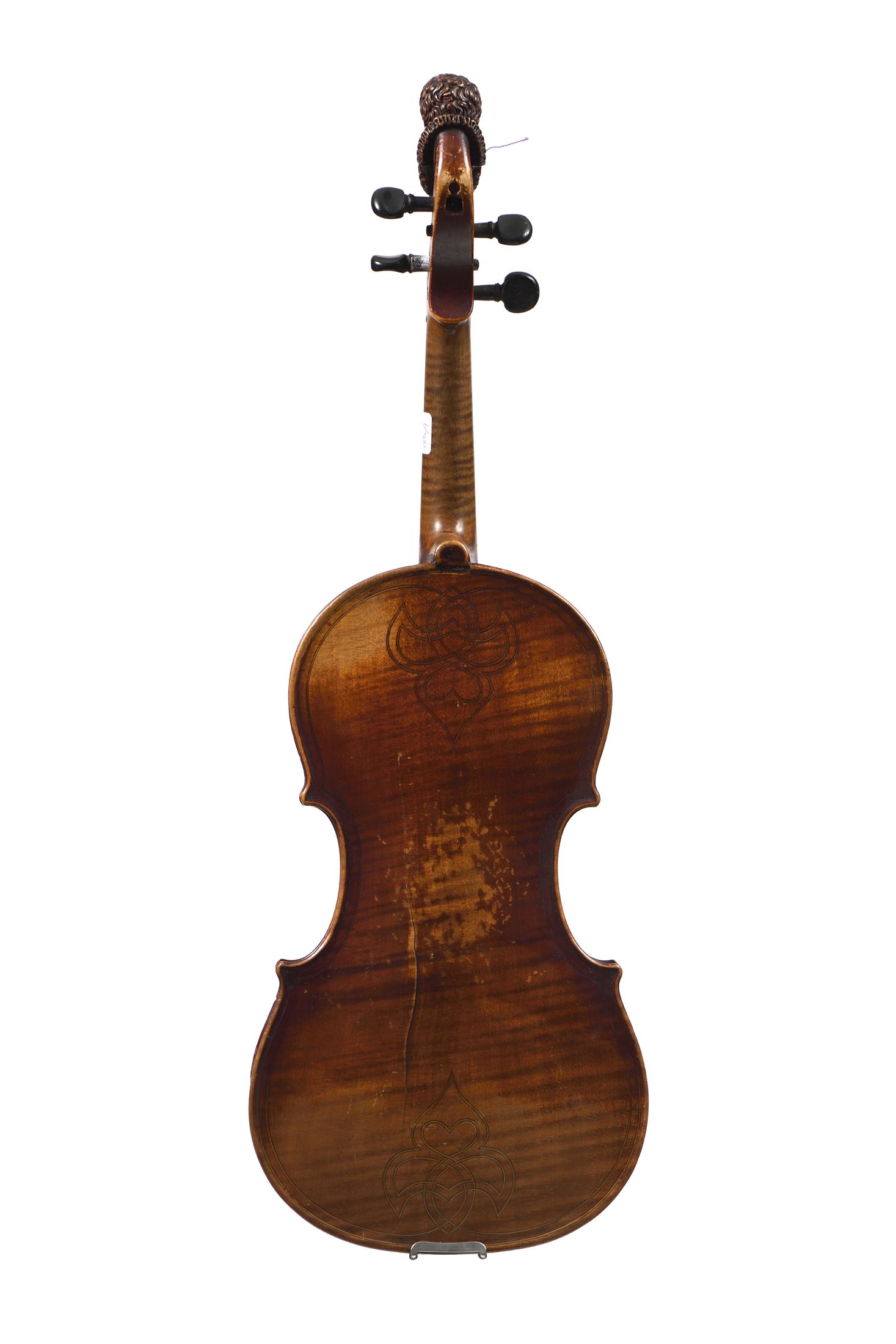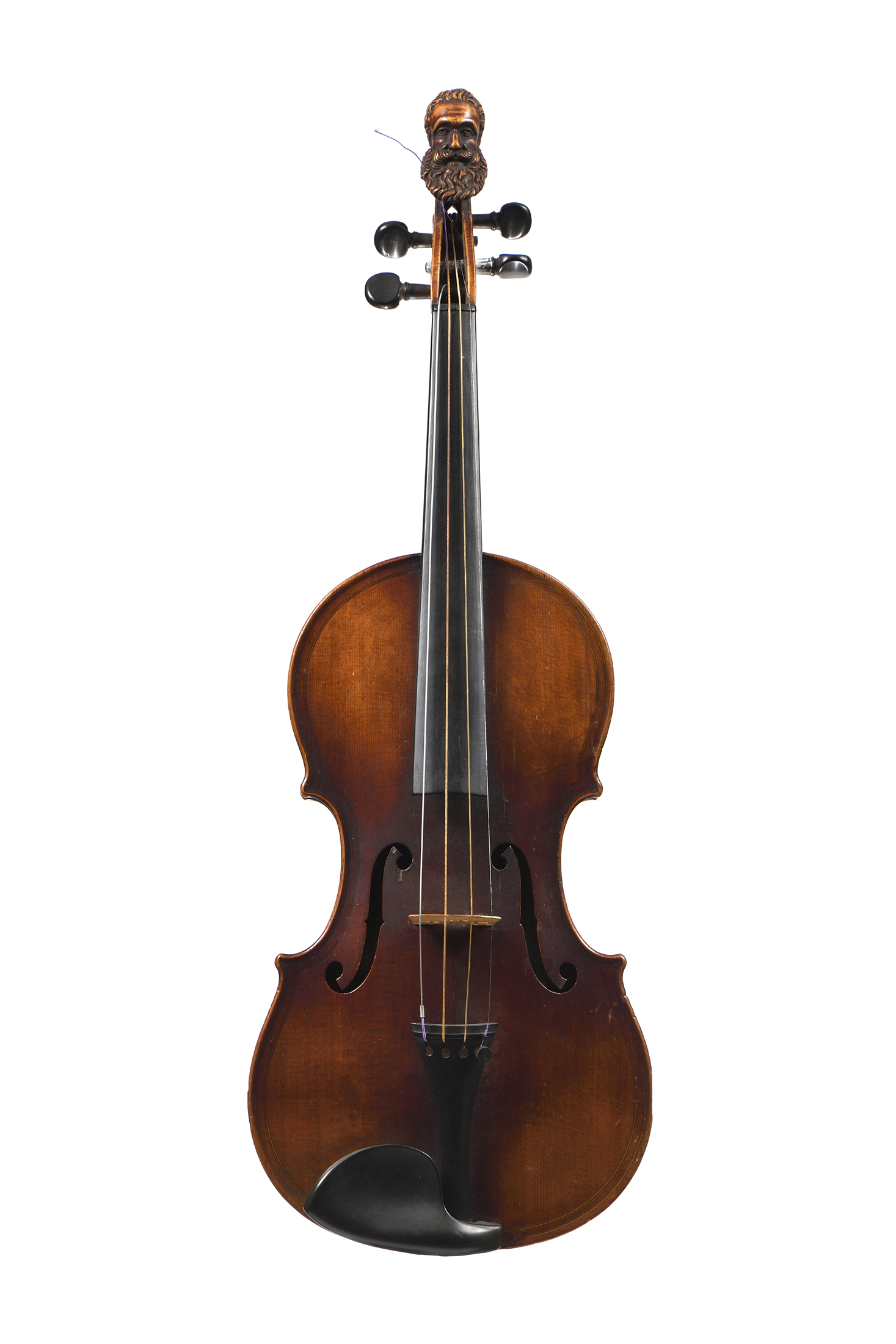 portant une étiquette "Jiovan Paolo Magini Brescia 1715" et une autre étiquette d'un musicien "Stéphane SALVAN..." . Tête sculptée d'un homme barbu. Fond d'une pièce en érable. Vernis brun rouge sur fond doré. Fait sur un modèle Magini avec double filets et un fond incrusté. Importante fracture d'âme au fond, et restauration au talon du manche. 365 mm.