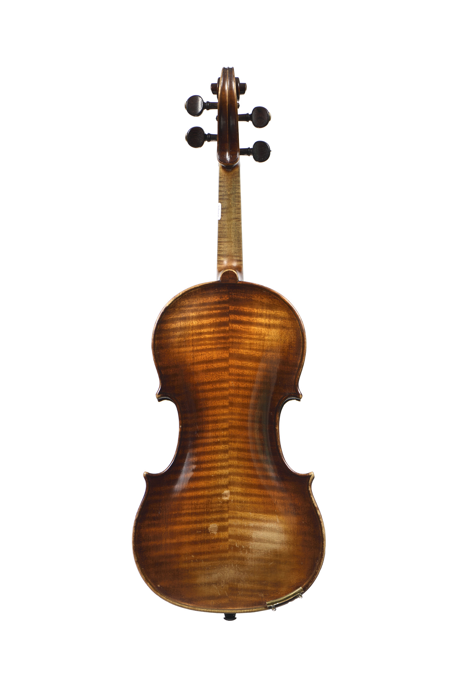 portant une étiquette "Paul Beusher". Fond de deux pièces en érable. Eclisses et tête du même bois. Vernis brun sur fond doré. 357 mm.