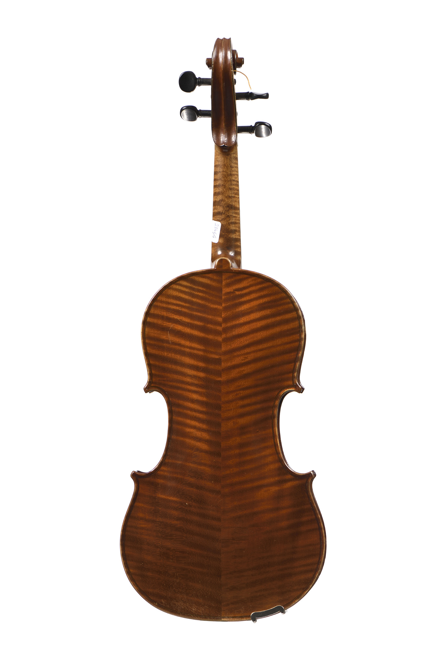 portant une étiquette "Stradivarius 1721". Fond de deux pièces aux ondes régulières montantes. Vernis brun doré. 359 mm. Avec boite et archet d'étude.