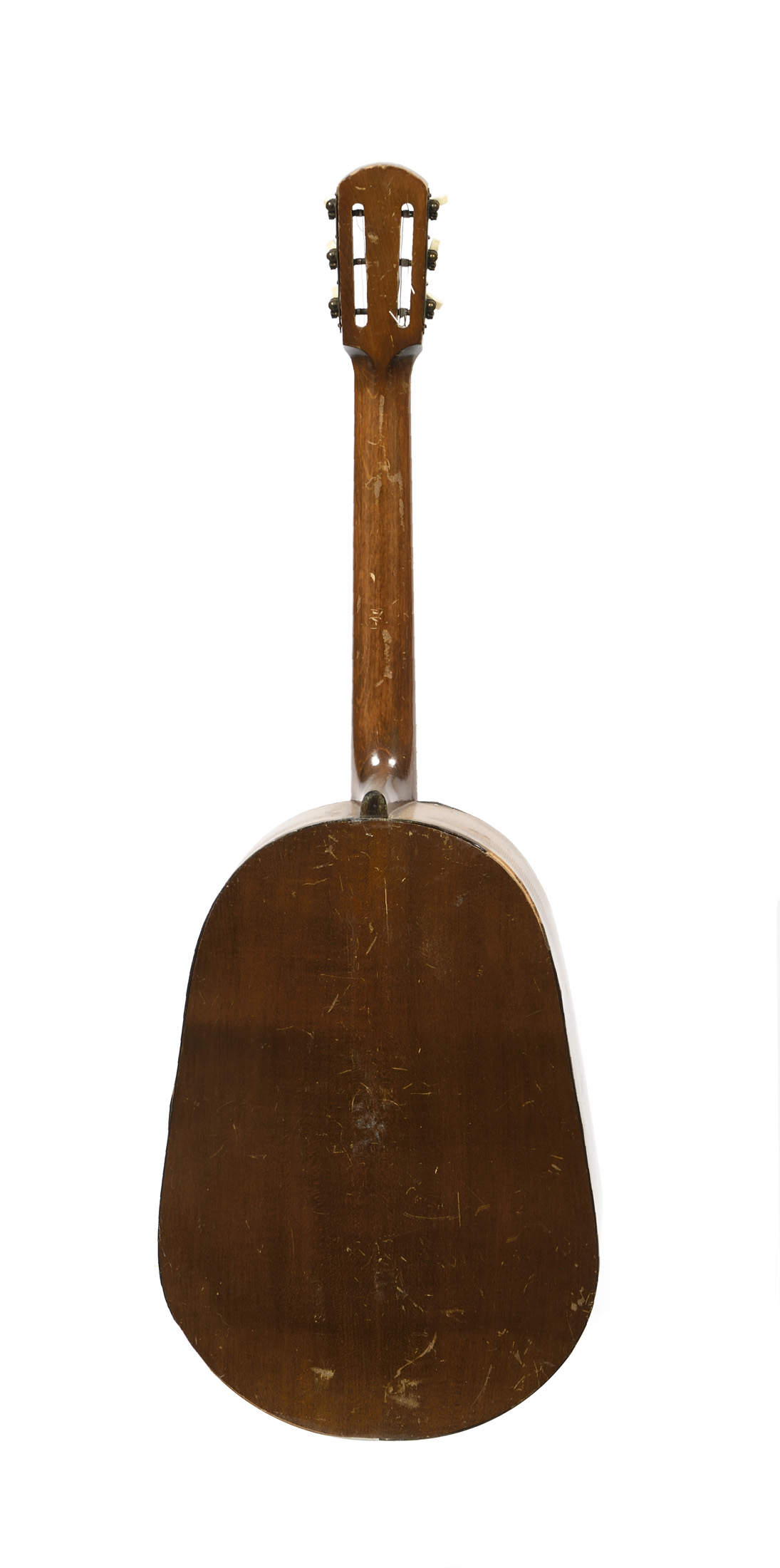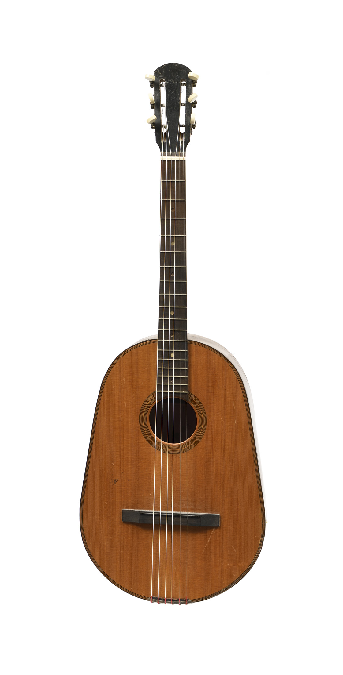 Guitare d'étude anonyme. Table en épicéa de deux pièces .Chevilles inversées. Diverses cassures et manques. Joint de la table à revoir.