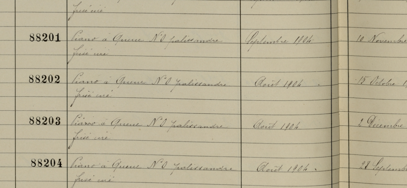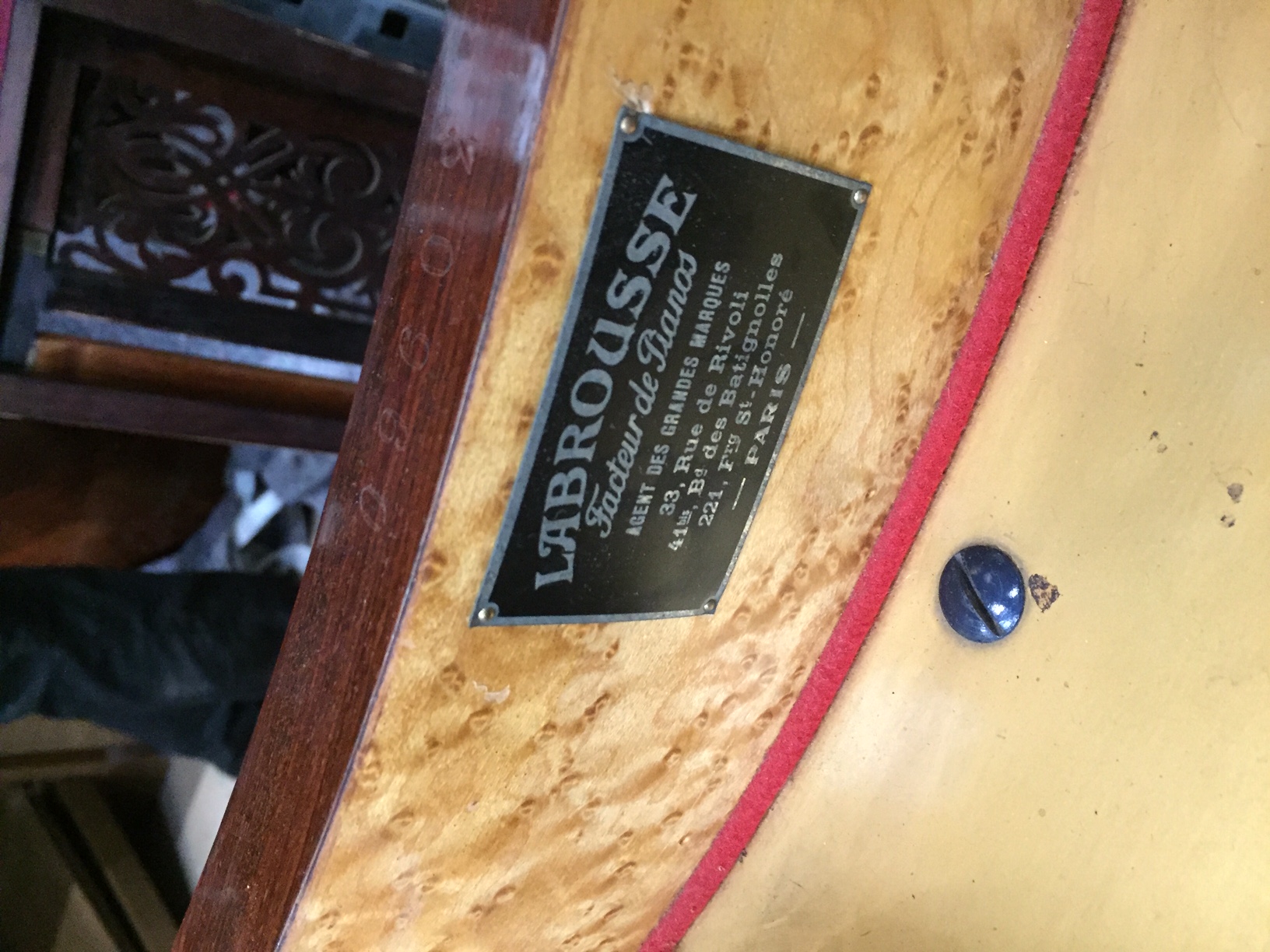 Placage de palissandre. Portant la marque et un cachet de facteur "LABROUSSE". Numérotation: 30960. 88202 sur le cadre. L'ensemble est à restaurer. Bon état de conservation.