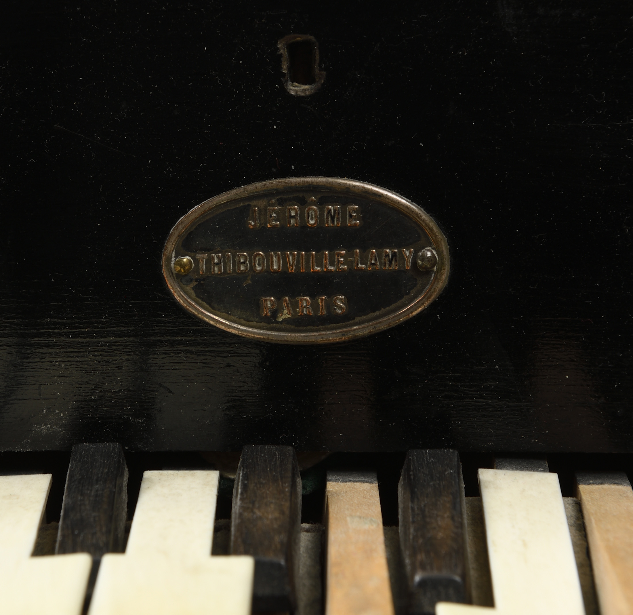 Portant la marque "Jerome Thibouville à PARIS". Bois laqué noir. Avec pédale. En l'état.