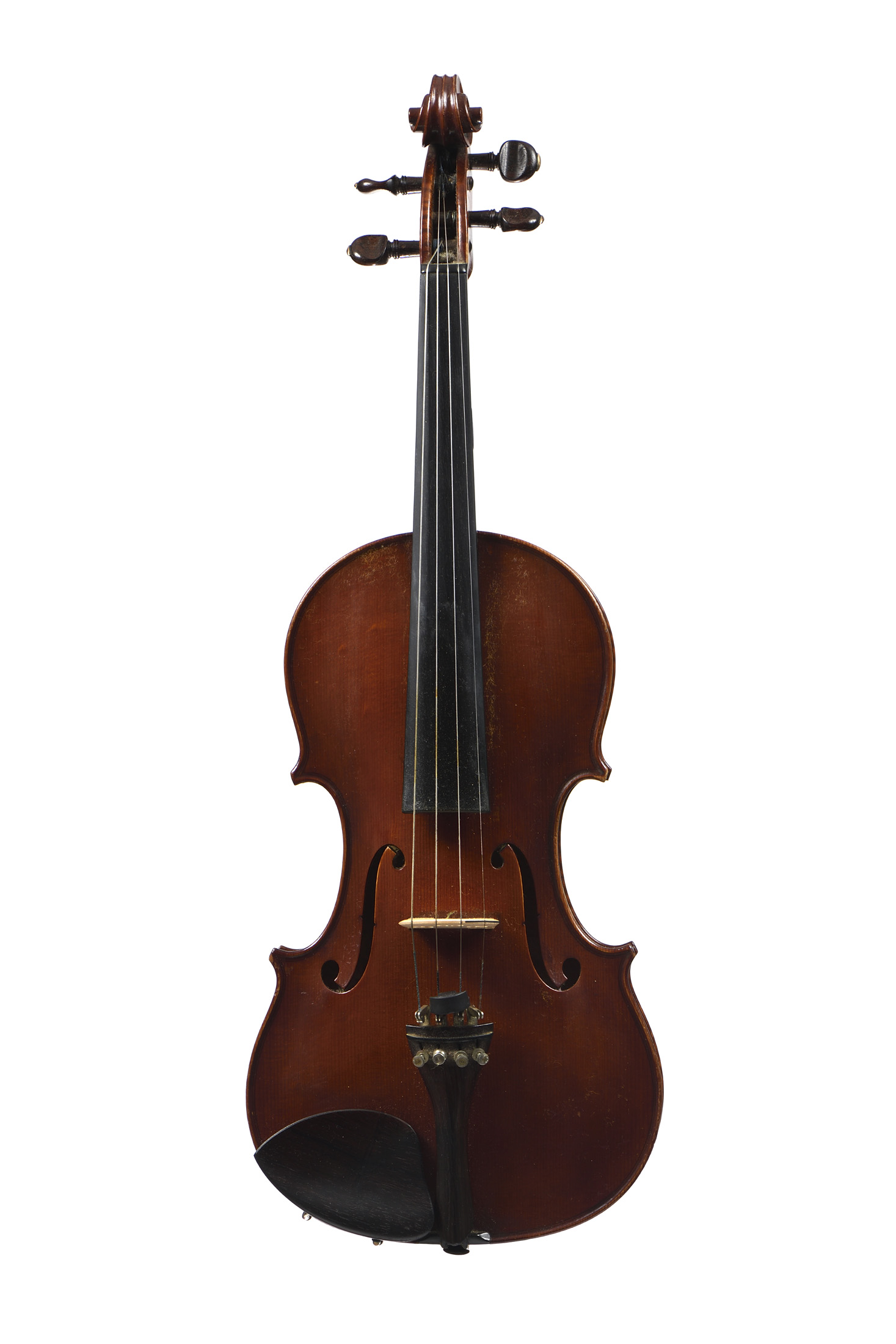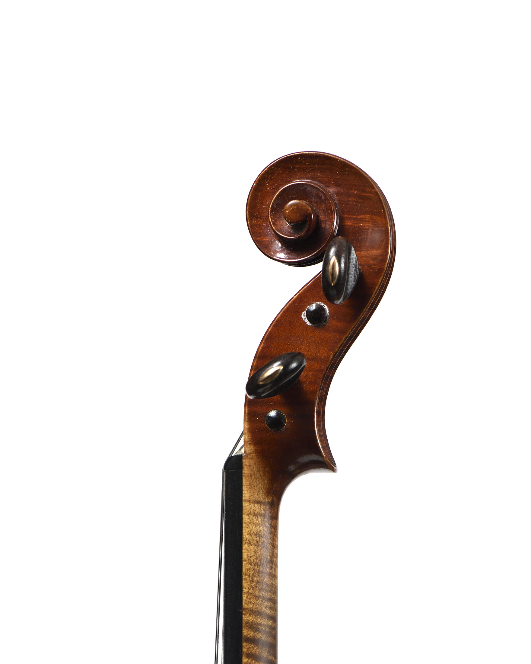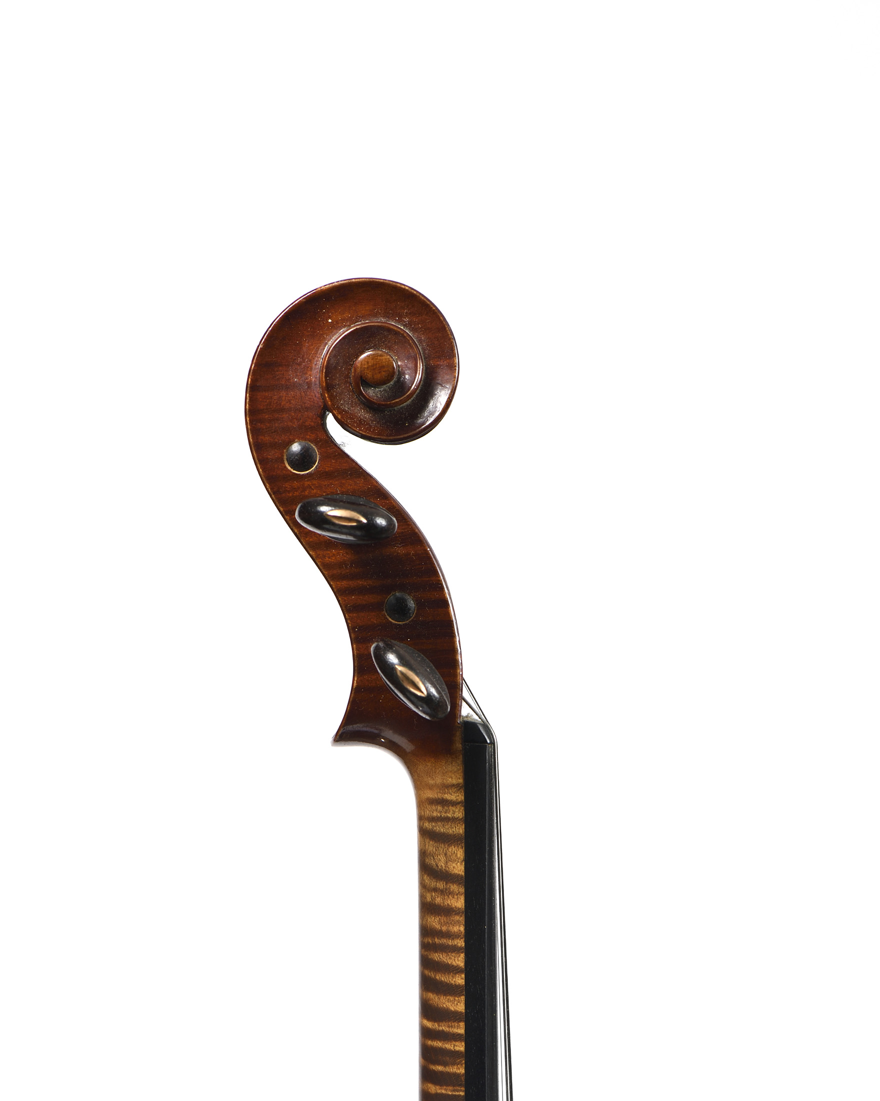 dont il porte l'étiquette originale "Fait par Paul Hilaire en 1964. N°34." Ainsi que ses signatures manuscrites sur l'étiquette et sur le fond. Fond d'une pièce en bel érable aux ondes régulières. Vernis brun orangé sur fond doré. 357 mm.
