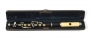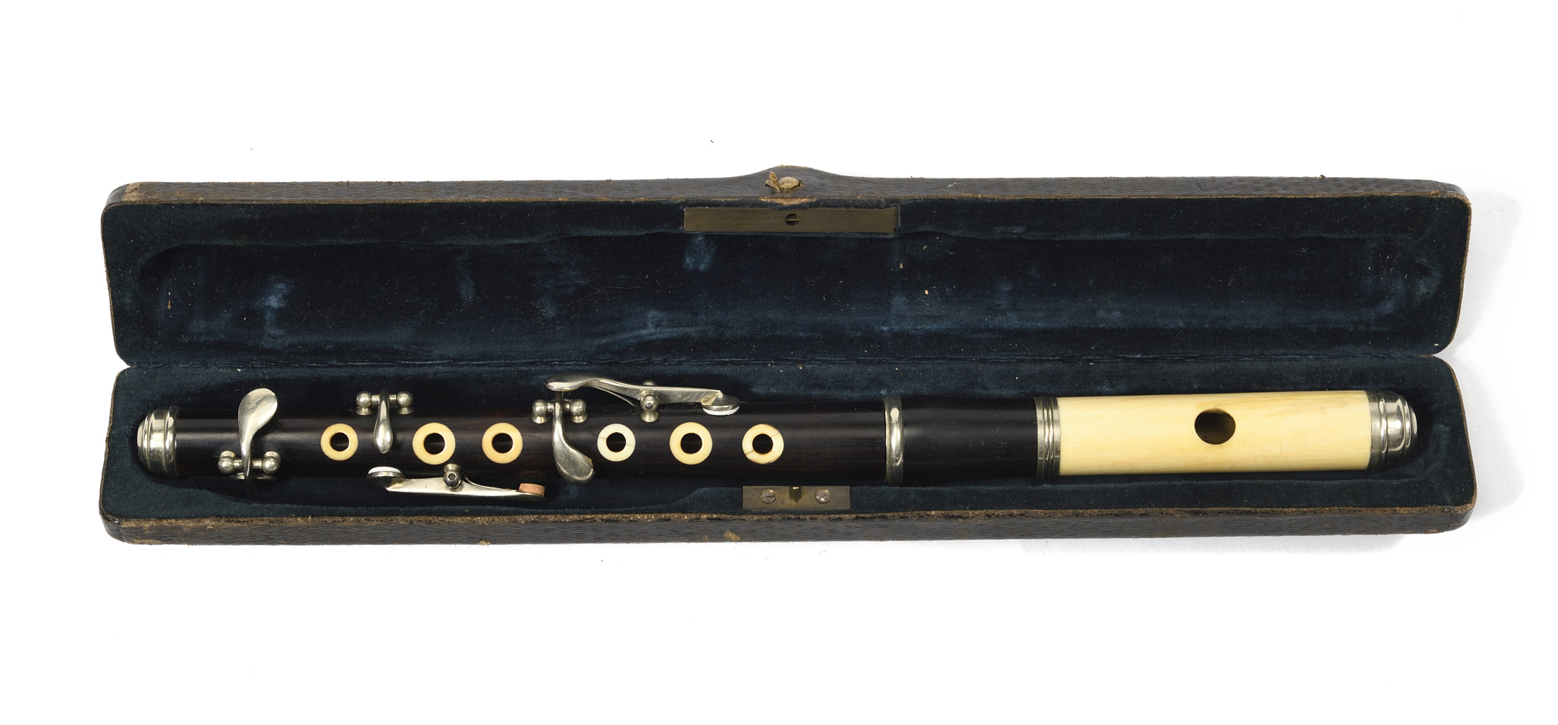 Flûte Piccolo en ébène. Tête et cheminée en ivoire. Cassures. Retamponnée, Restaurée. Clefs maillechort. Avec sa boite.