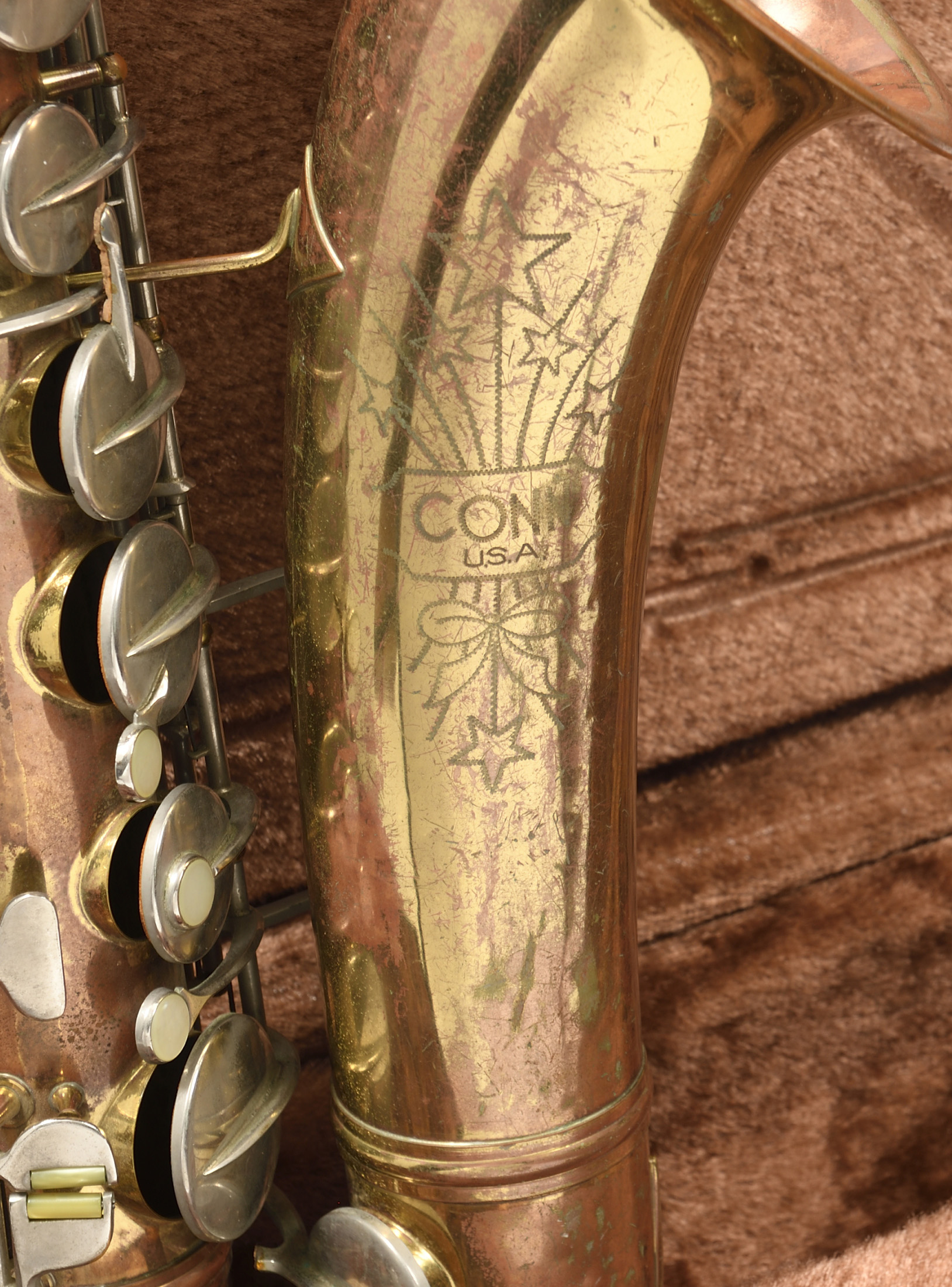 portant la marque CONN USA. En laiton partiellement devernis.16M. Numéroté 642721. Bosselé à la culasse. Avec boite. En l'état.