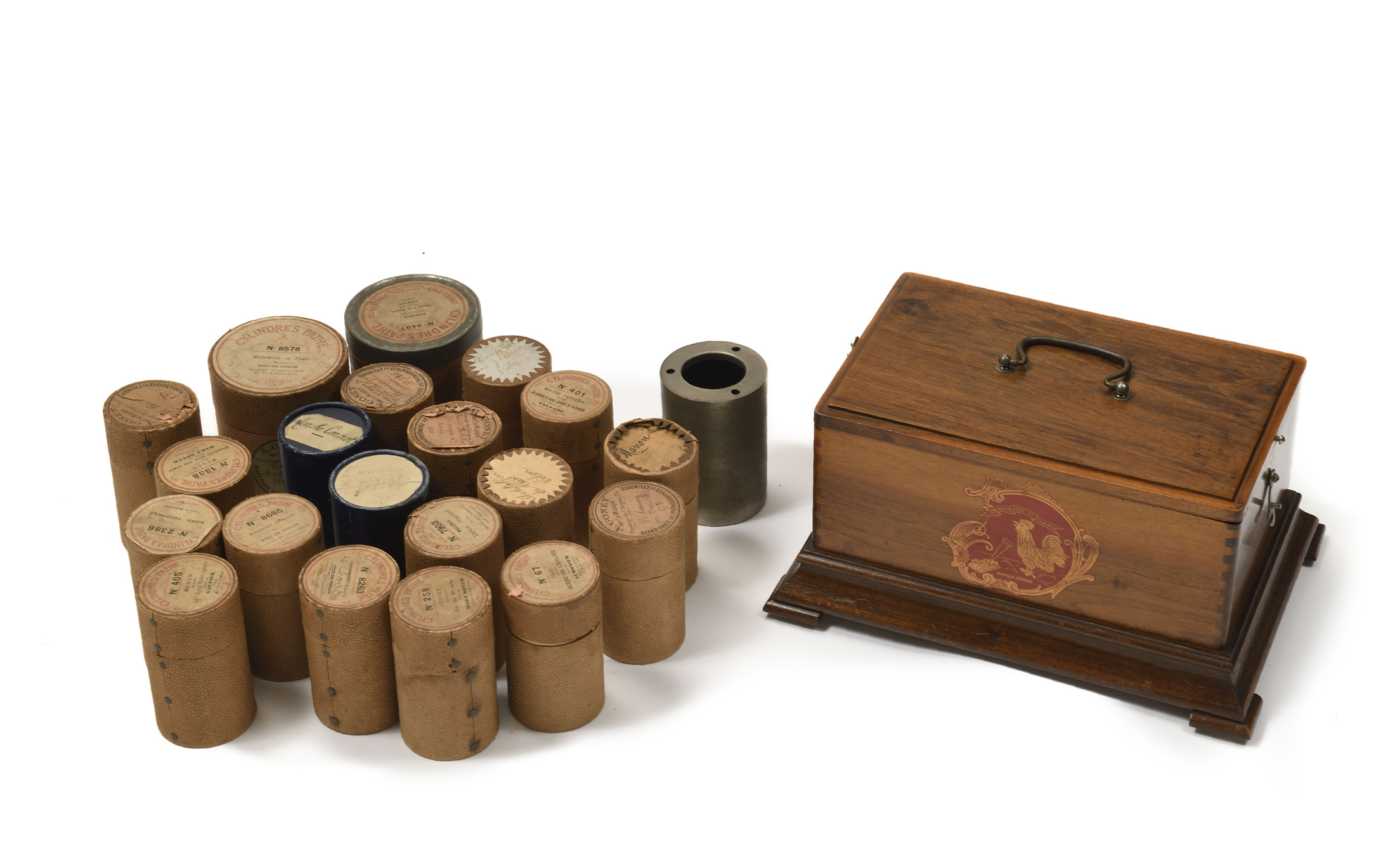 Dans sa boite en acajou. Avec 20 Cylindres. Accessoires et répertoire des phonographes 1904.