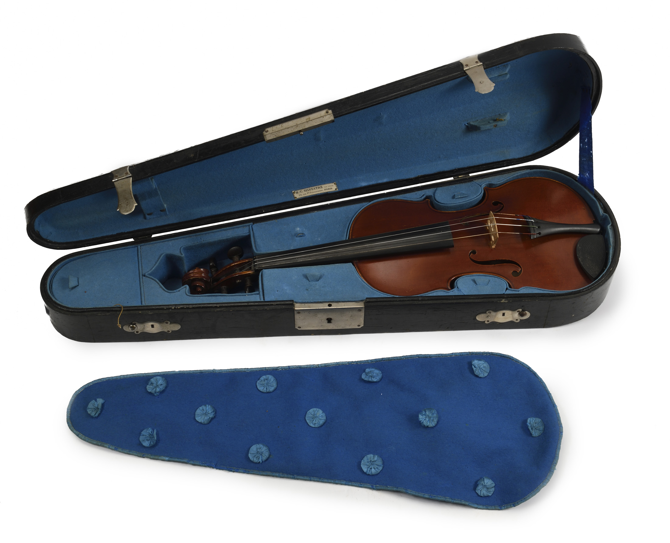 Très beau violon, dont il porte l'étiquette originale au millésime de 1888, Numéro 234. "H . C . Silvestre à Paris", et la marque au fer "SILVESTRE Neveu à Lyon" sur le tasseau du manche à l'intérieur. Vernis brun rouge. Fond de deux pièces en bel érable aux ondes larges. Eclisses et tête du même bois. Avec ses accessoires d'origine: boite et chevalets "SILVESTRE ET MAUCOTEL".