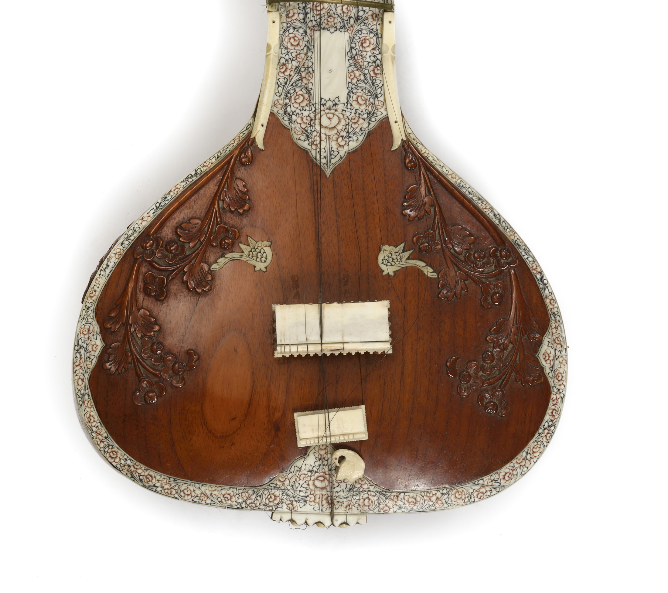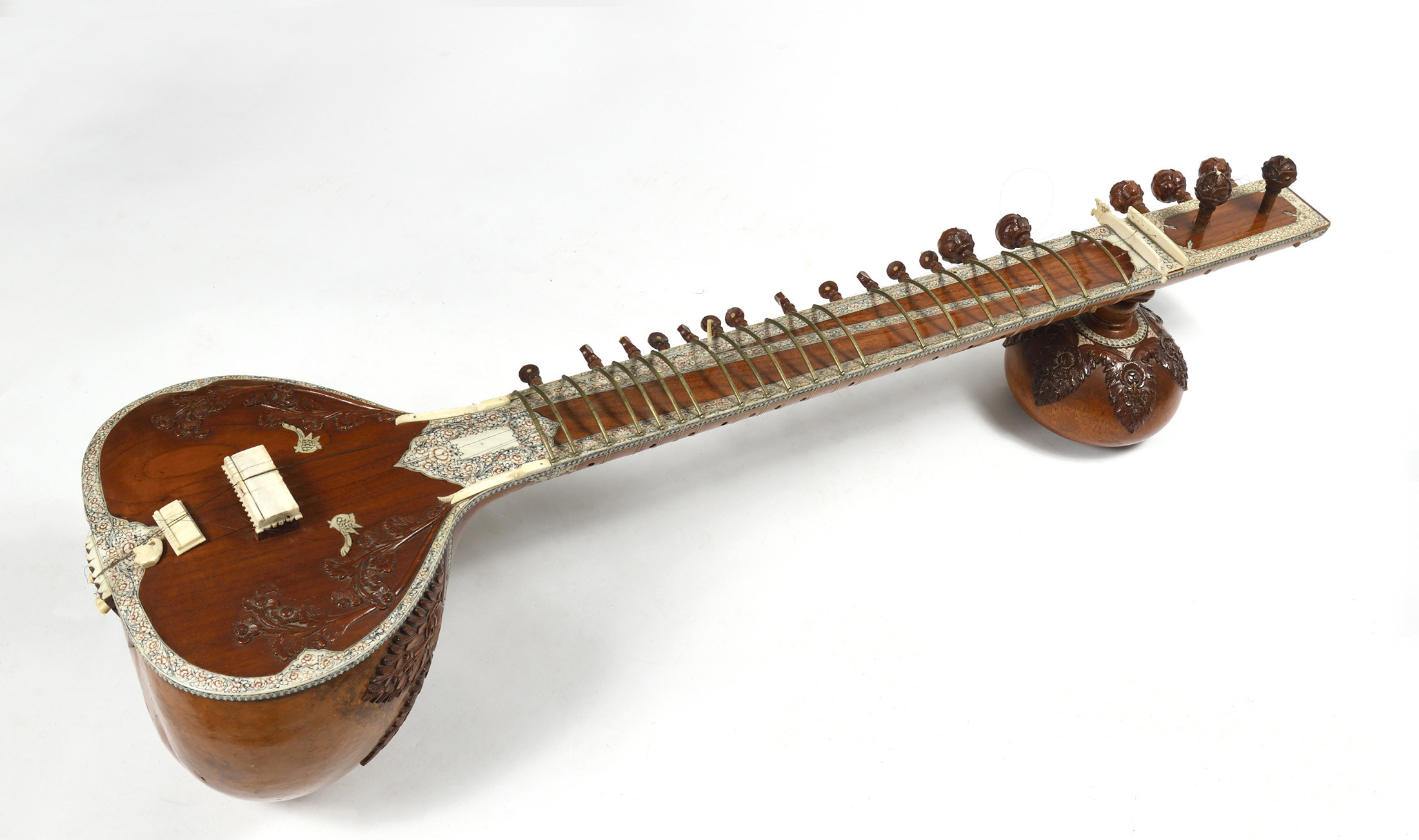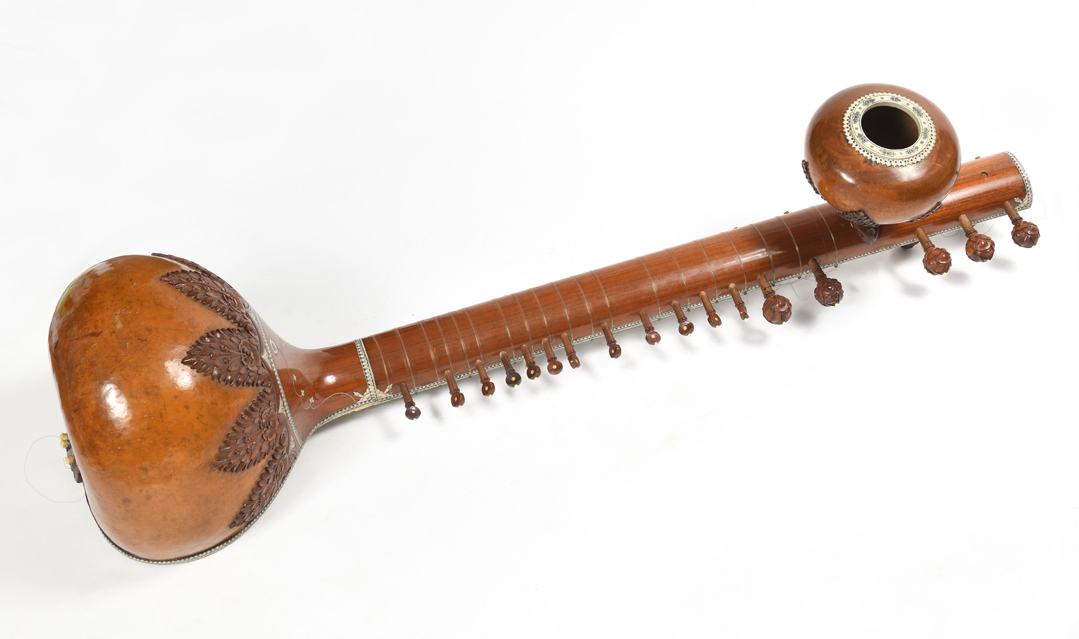 Intéressant luth moderne Indien "Vînâ Saraswati" finement sculpté et incrusté. Portant le nom de la déesse hindoue Saraswati. Caisse sculptée, en calebasse.