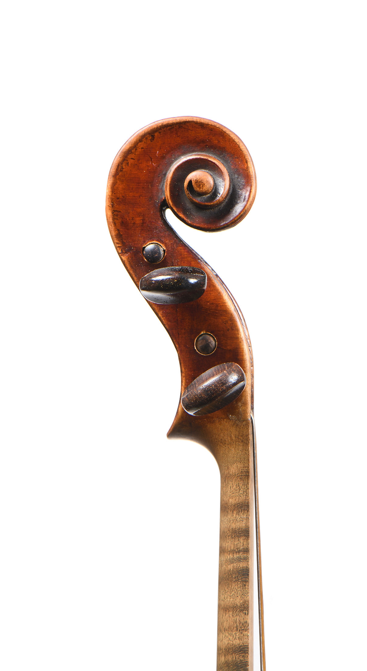 portant une étiquette "Jean-Baptiste Vuillaume à Paris, rue Croix des petits champs". Fait vers 1850, probablement par Etienne DROUIN. Fond d'une pièce en érable. Vernis brun rouge sur fond doré. Diverses cassures. Manque une éclisse du haut et la touche. 360 mm.