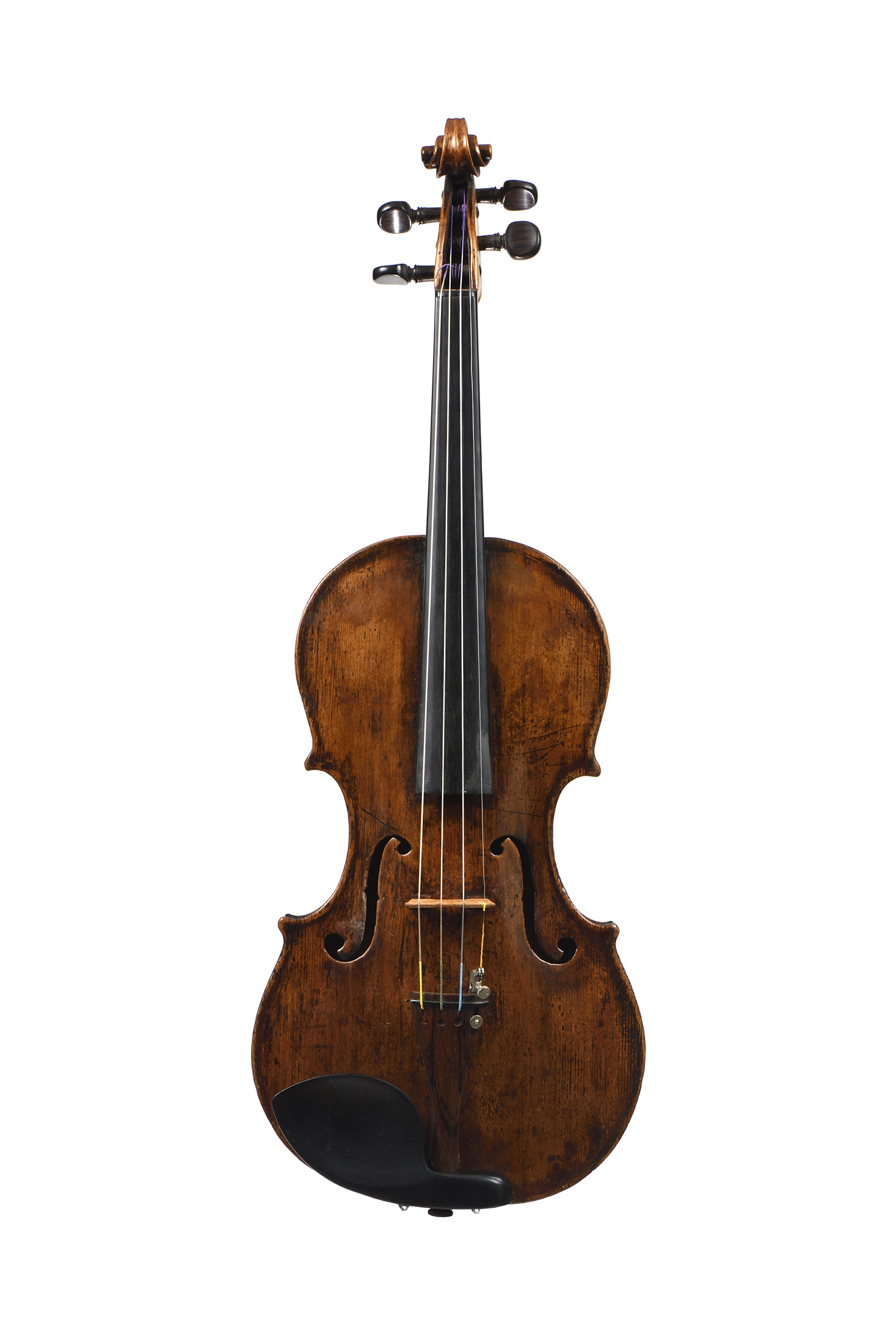 Intéressant violon fait au XVIIIe, portant une étiquette apocryphe "Taningard 1746...". Fond de deux pièces en érable avec une marque illisible. Vernis brun doré. Non fileté. Diverses cassures, usures... Bon état de restauration. 357 mm.
