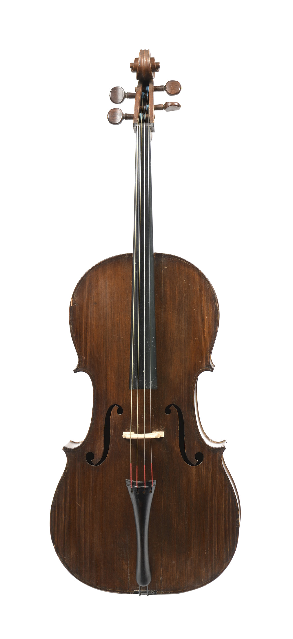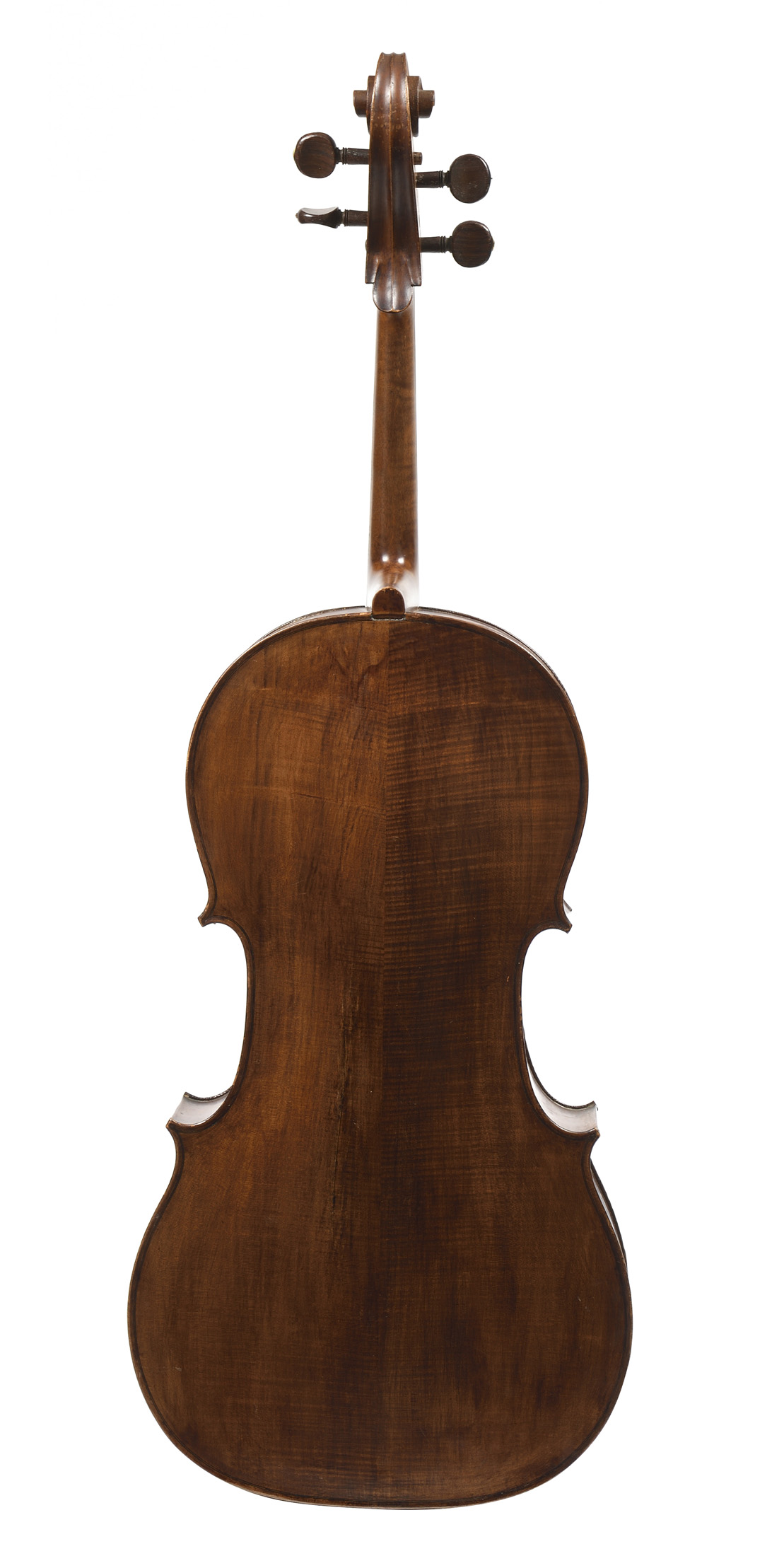 portant une étiquette "Bertholini". Fond de deux pièces en érable. Diverses restaurations à revoir. Diverses restaurations. Cassure d'âme au fond. Avec archet moderne. Avec boite moderne. 752 mm.