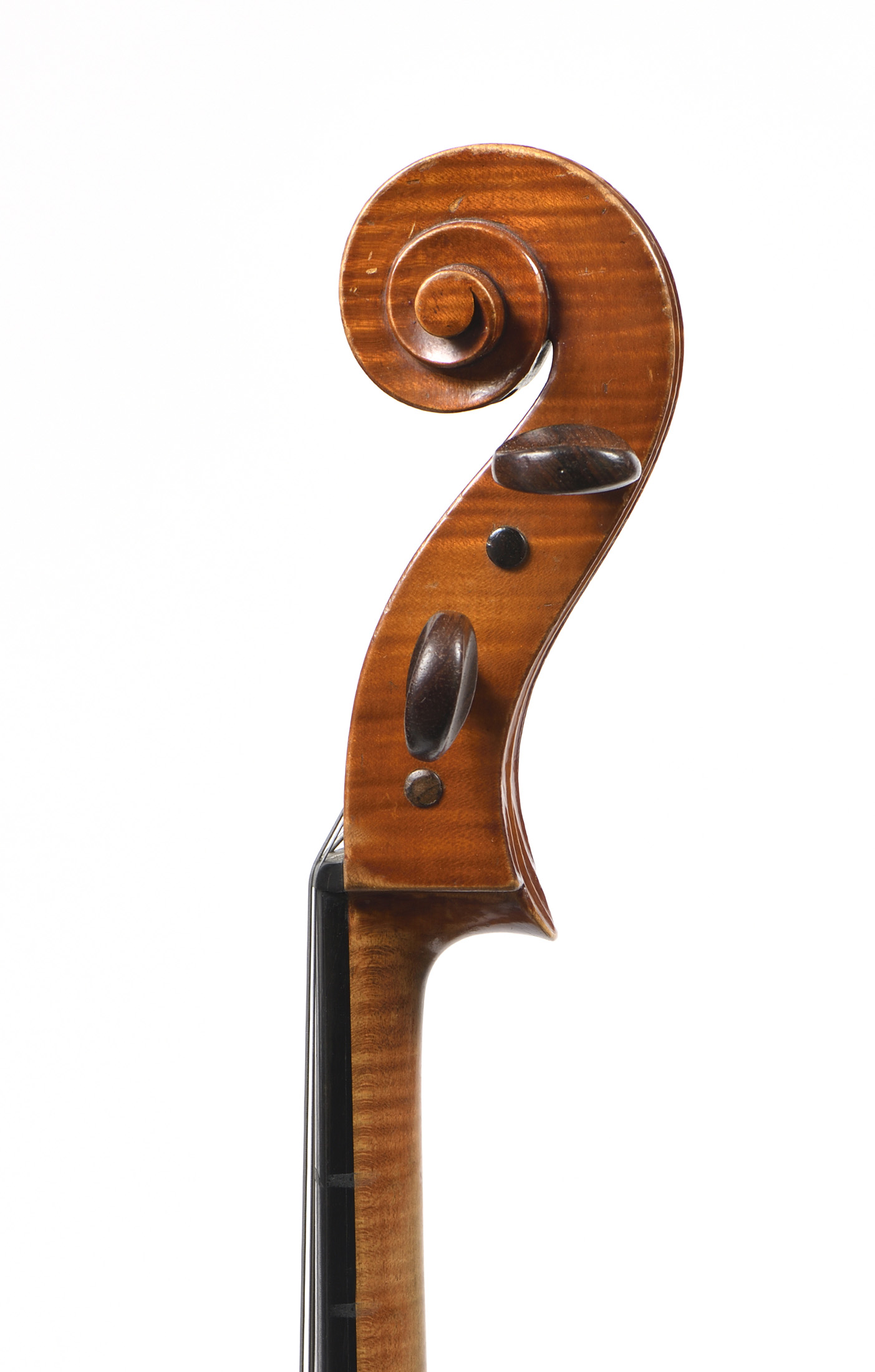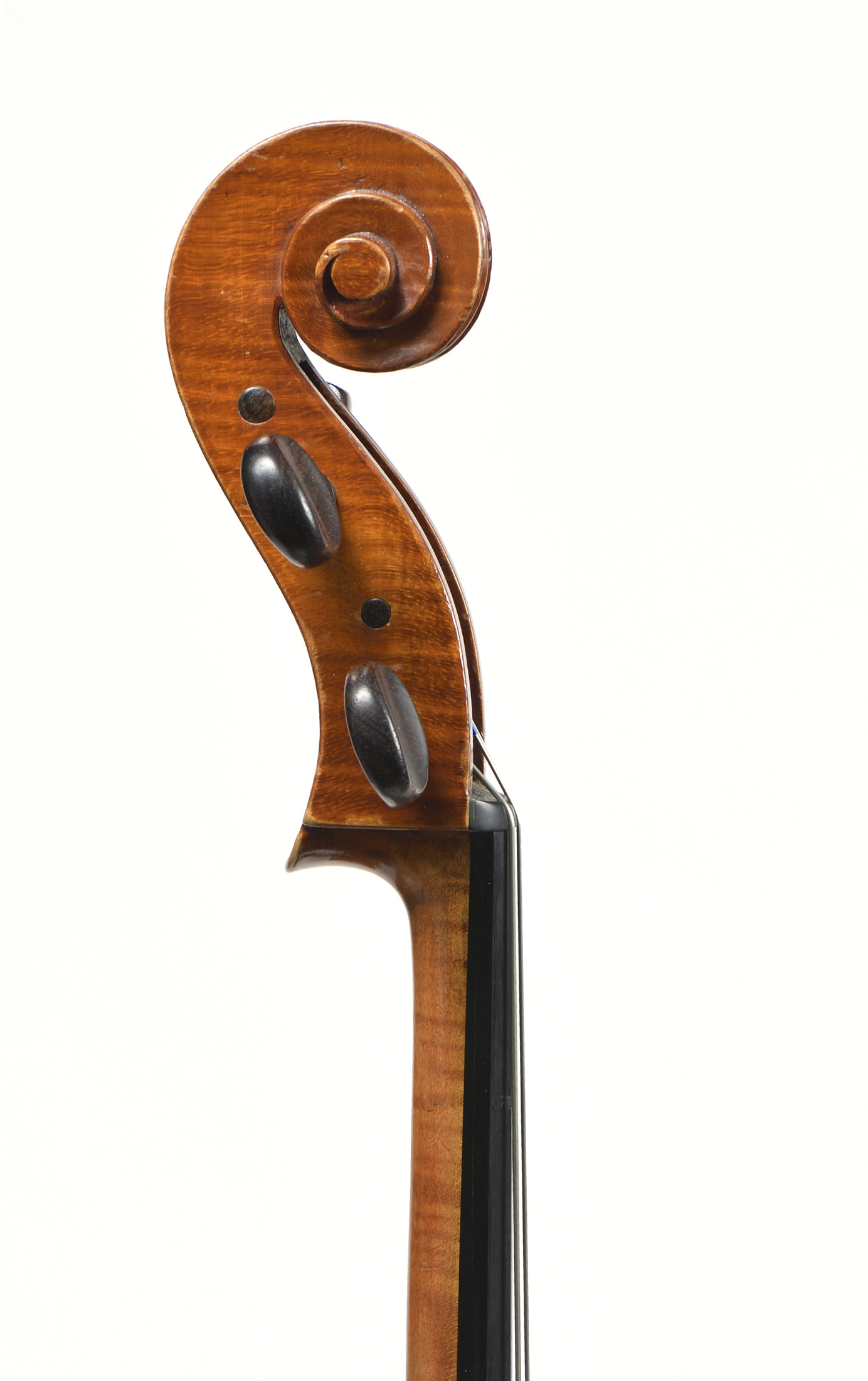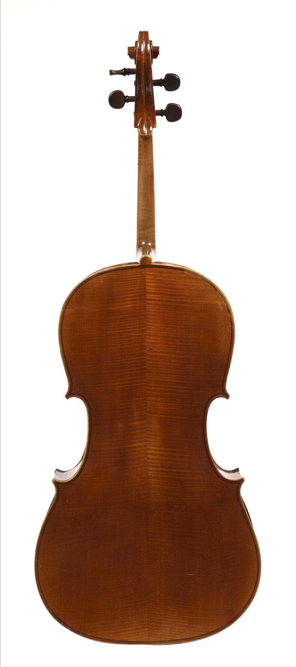 portant une étiquette apocryphe: "Carlo Antonio Testore.". Fond de deux pièces en bel érable aux ondes régulières. Table en épicéa. Vernis brun orangé. 762 mm. Usures. Bon état général.