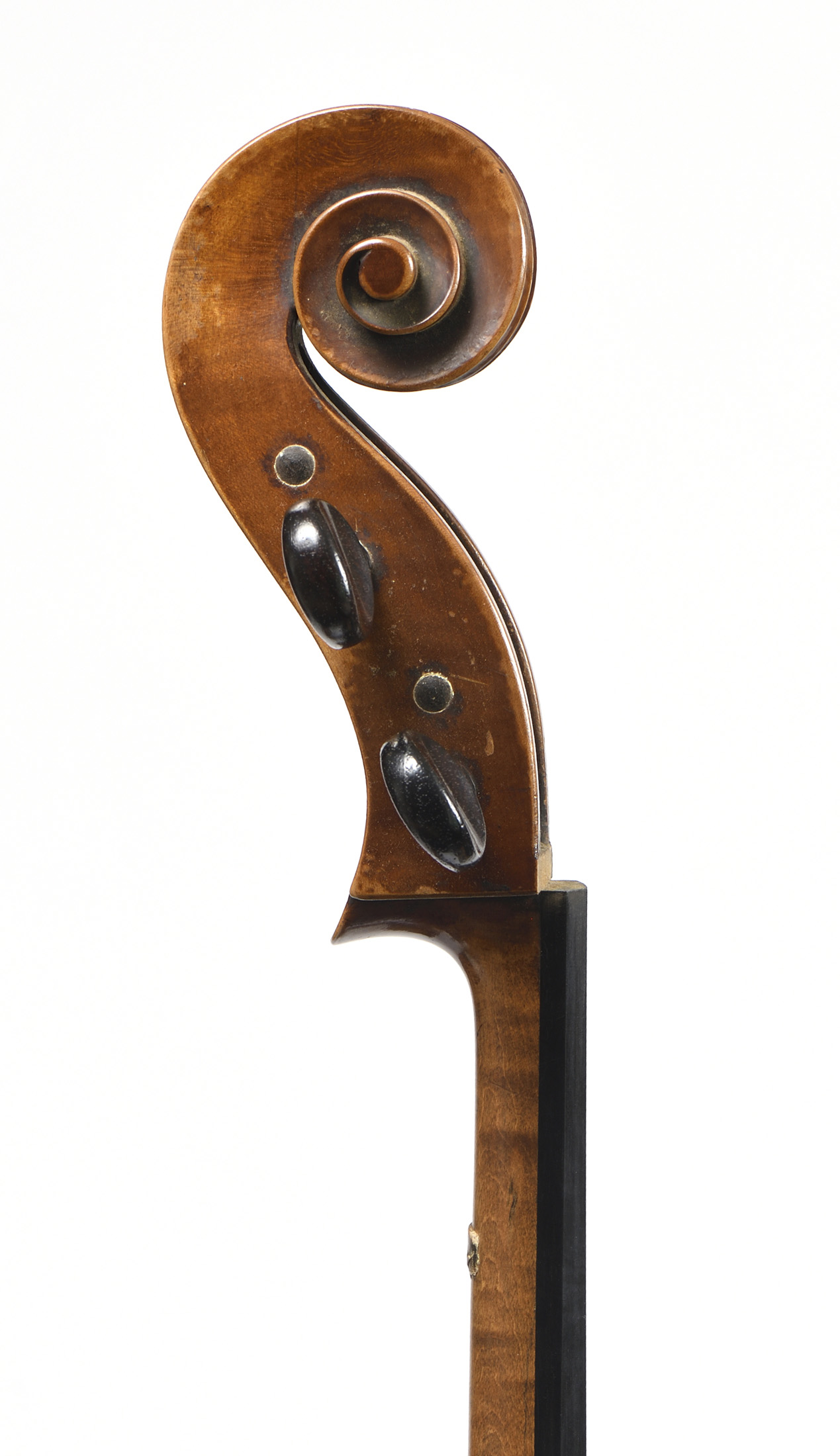 dont il porte l'étiquette : "L. MOUGENOT JACQUET GAND fait spécialement pour Paul JOMBAR. 37 rue de Rome à Paris." Fond de deux pièces en érable. Table en épicéa avec diverses cassures de table restaurée dont une à l'âme. Vernis brun sur fond doré. 767 mm.