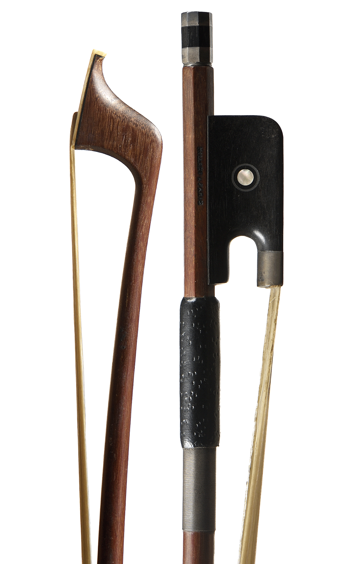 Archet d'étude fait pour la maison MILLANT à Paris dont il porte la marque au fer "MILLANT A PARIS". Baguette ronde en bois de pernambouc. Hausse ébène montée argent. Bouton argent. 82 g. 701 mm.