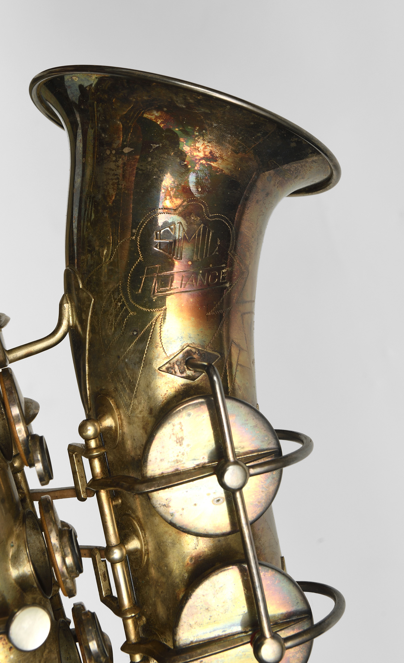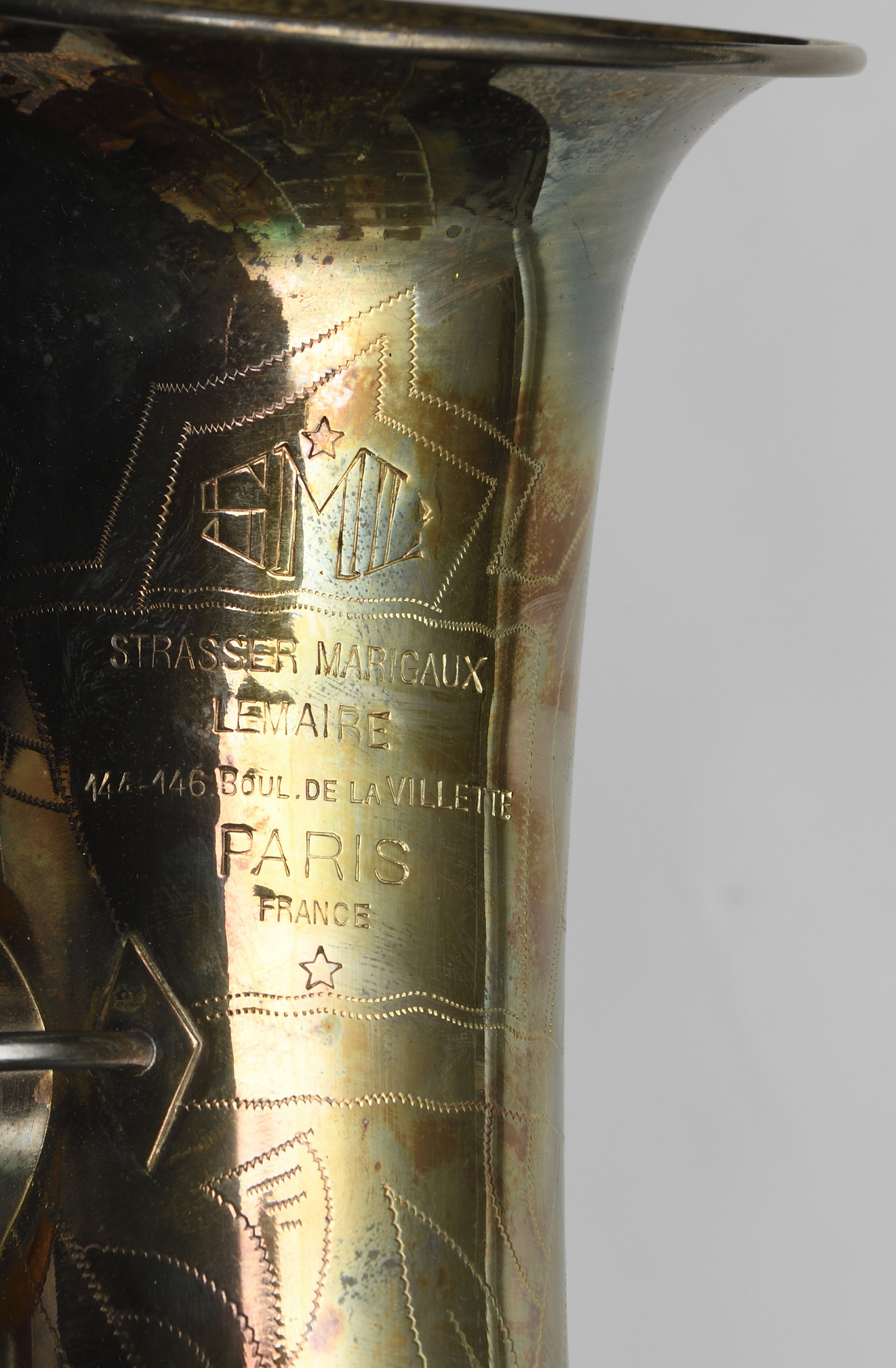 portant la marque gravée sur le pavillon. Argenté. Rayures, bossué. Avec boite d'origine.