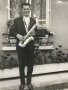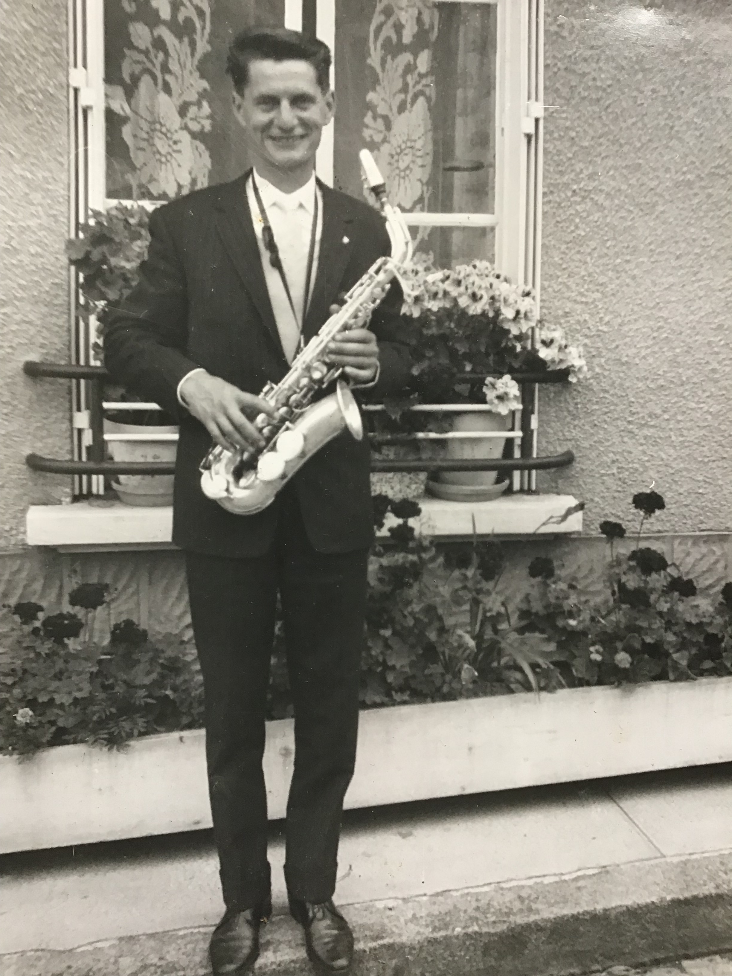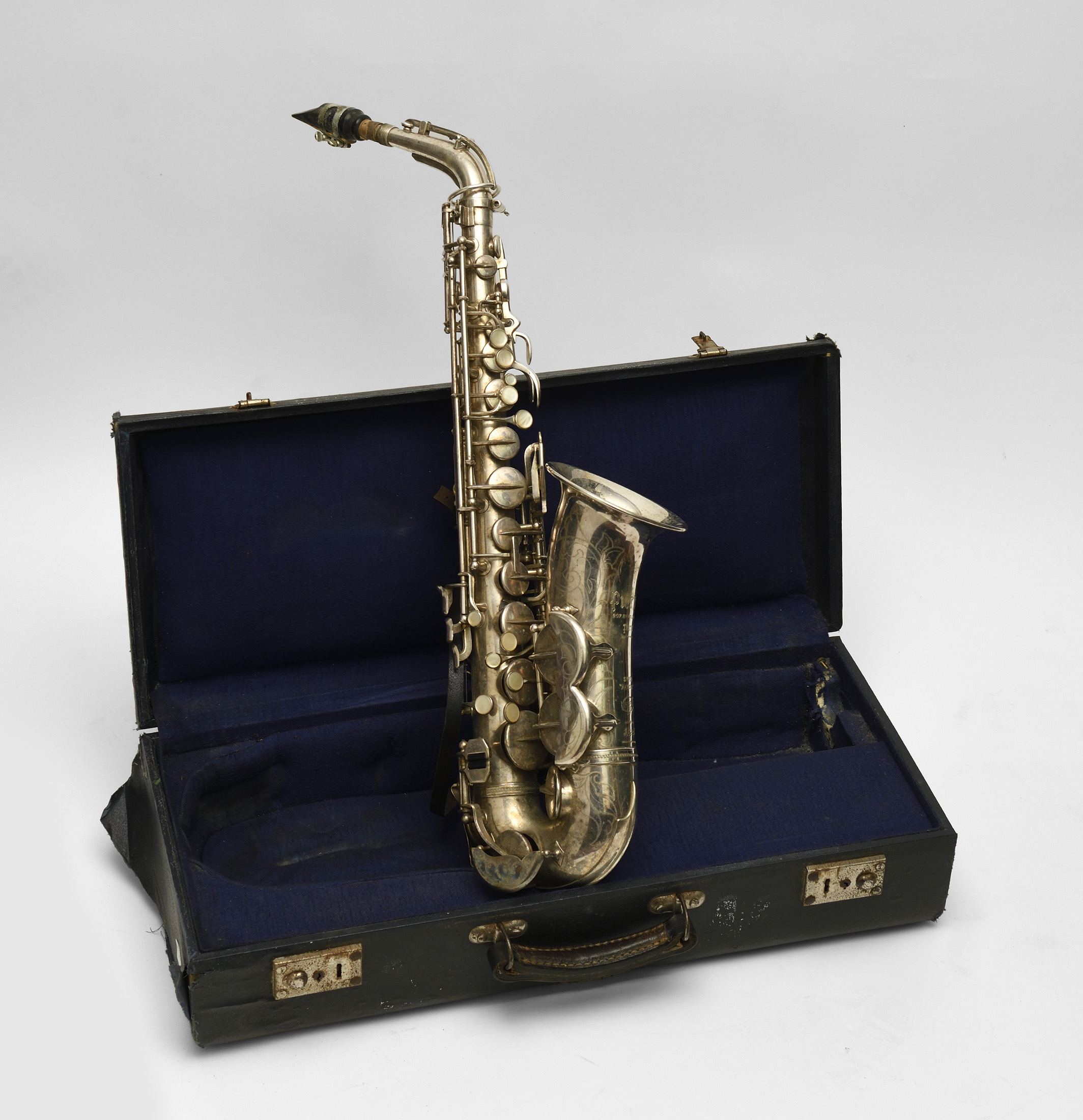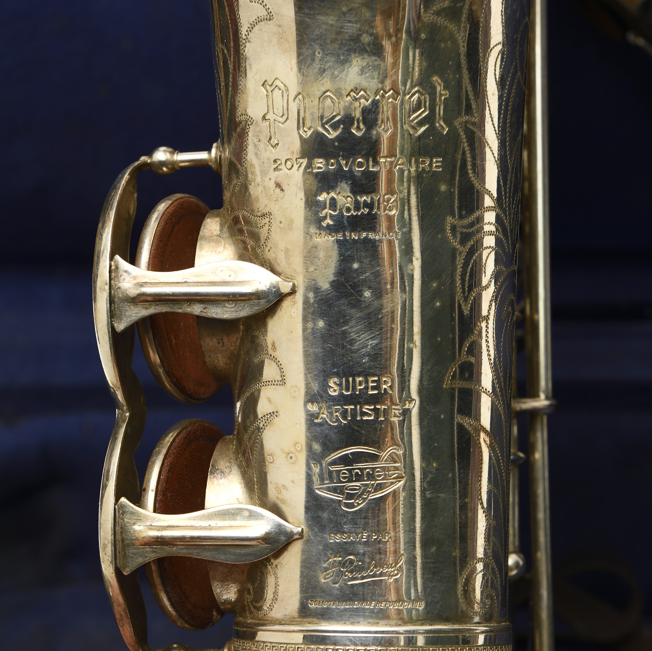modèle "Super Artiste". Portant la marque gravée sur le pavillon. Argenté. Avec boite et accessoires. Bossué et rayé.