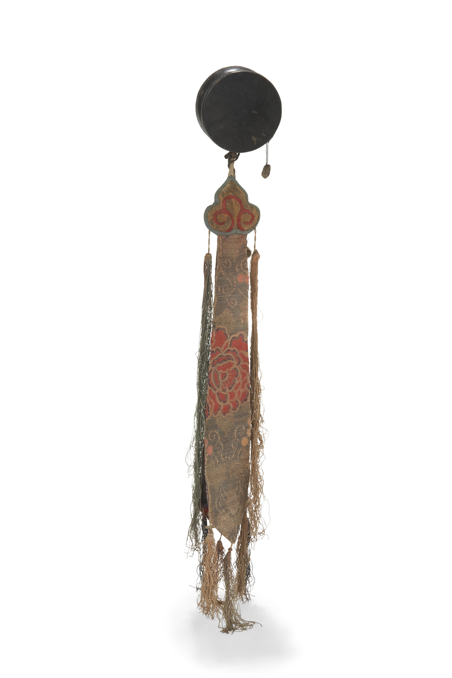 Tambour à boules fouettantes. "Damaru" Chine. H : 6 cm. D : 9 x 9 cm.