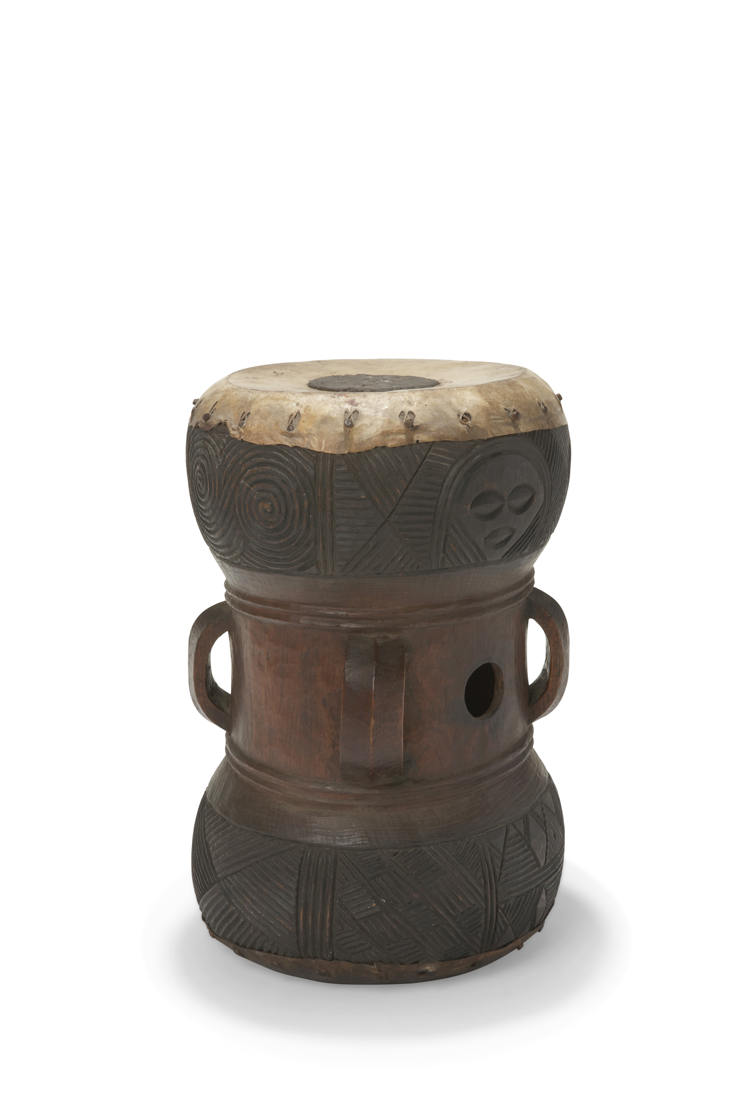 Membranophone, tambour en sablier du Congo. H : 46 cm. D : 29 x 29 cm
