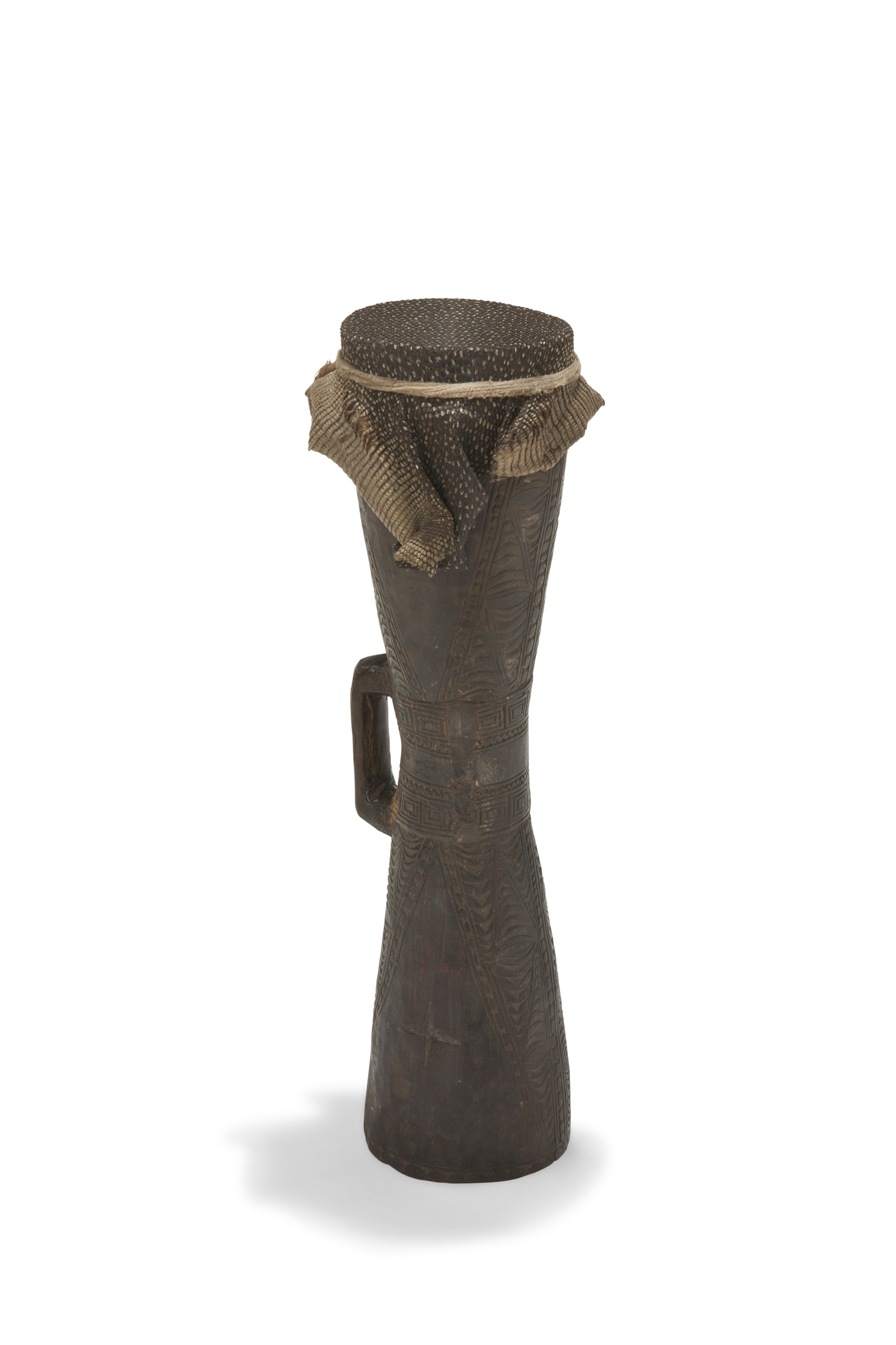 Tambour en sablier en bois sculpté à une peau. Indonésie.