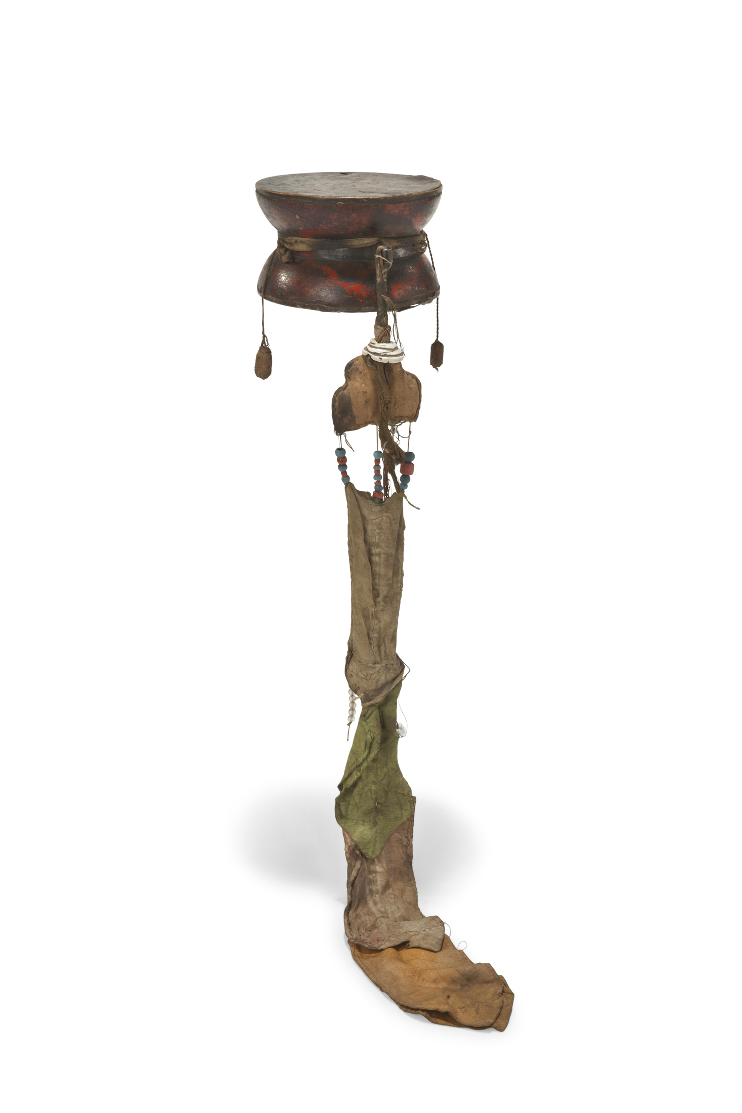 Tambour à boules fouettantes. "Damaru" Chine Népal. 16 x 9 cm.