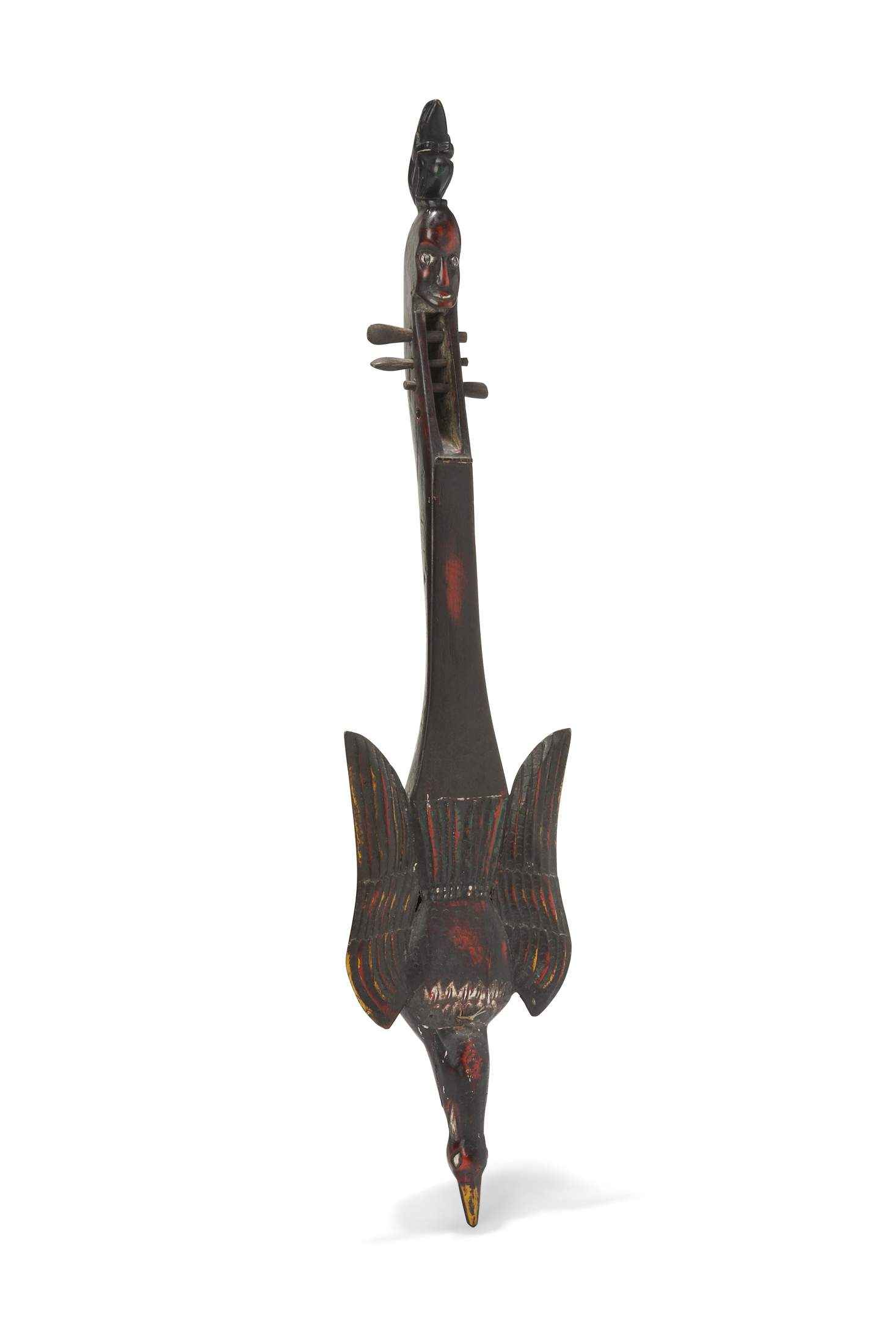 Viele à bras indonesien sculptée d'un oiseau peint. L: 85 cm.