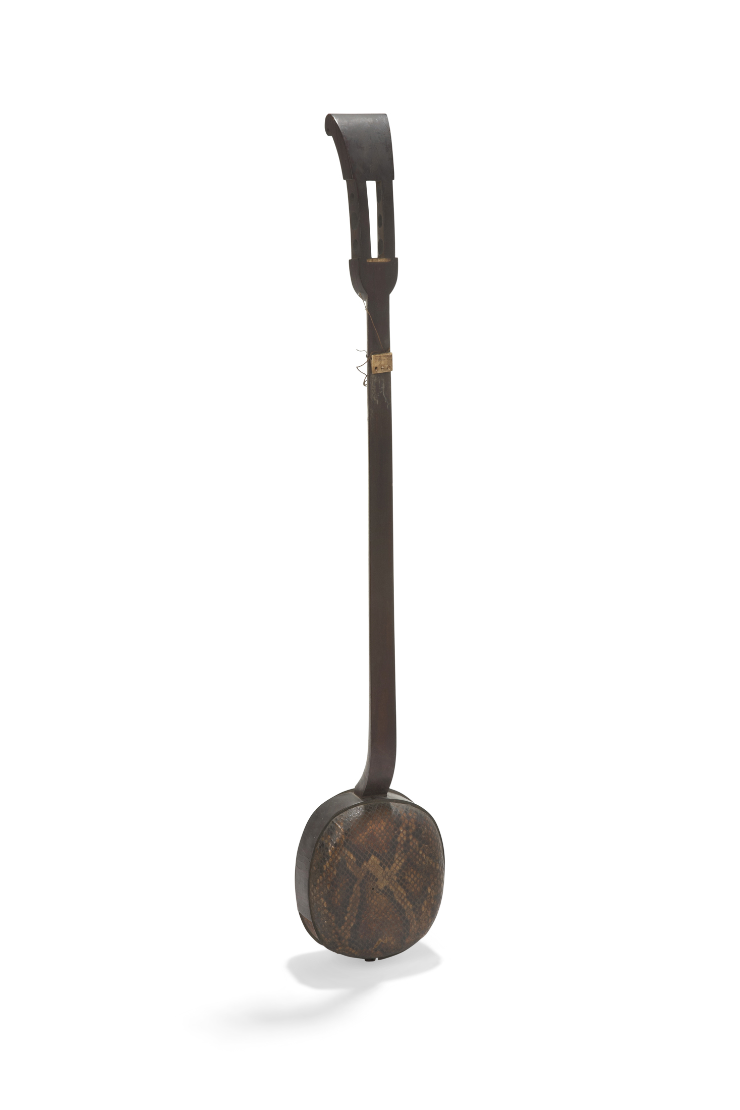 Sanxian. Instrument à 3 cordes pincées, peau de serpent tendue, sans chevalet, sans chevilles. 78 cm.