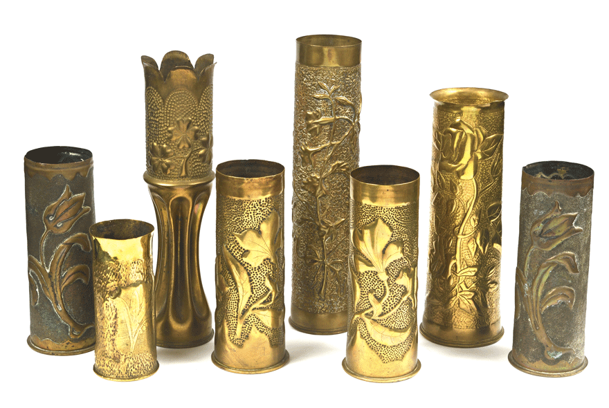 Ensemble de sept vases sculptés dans le cuivre des obus.