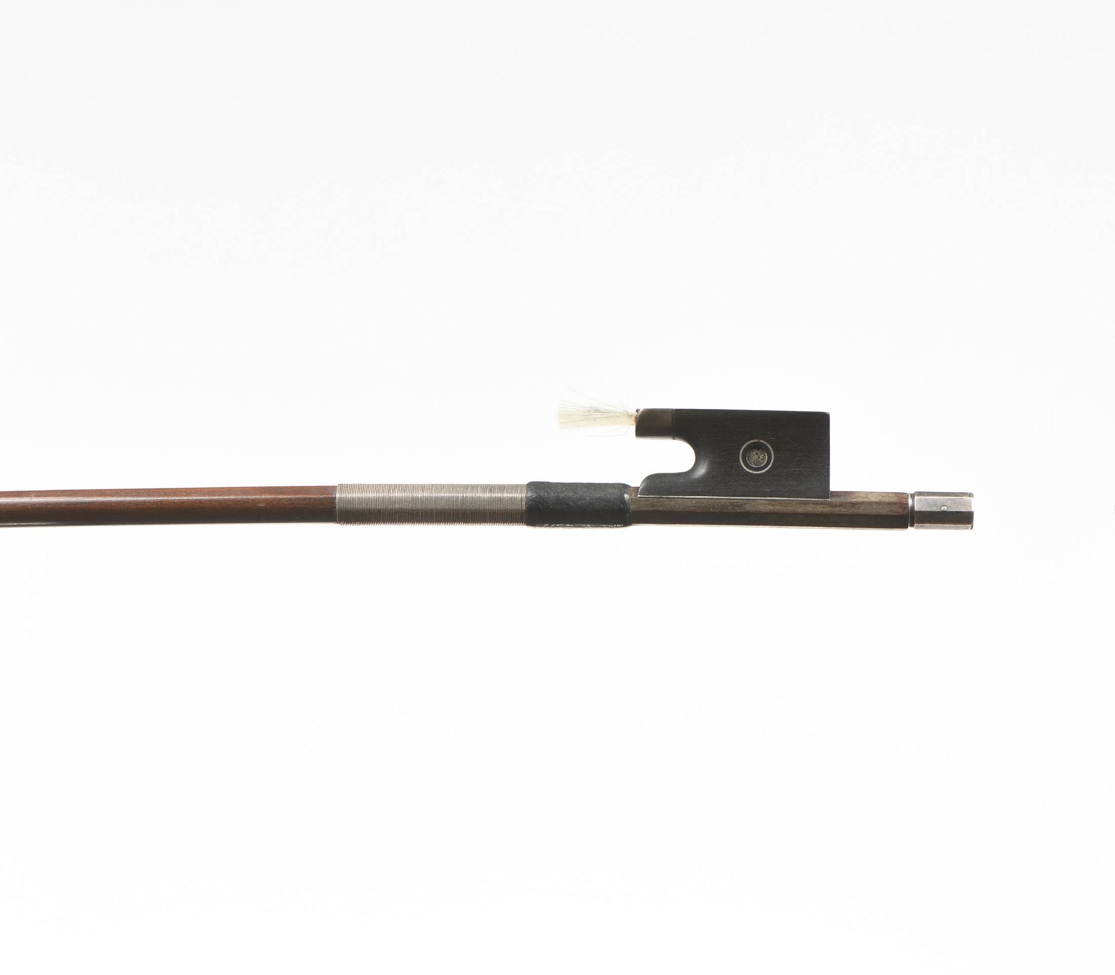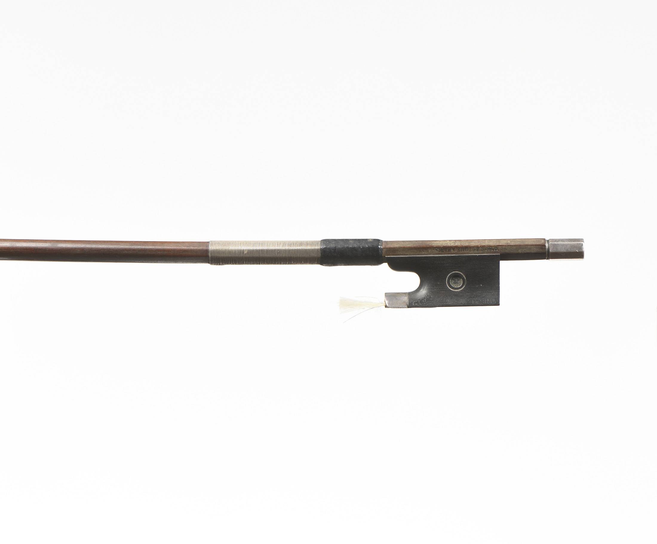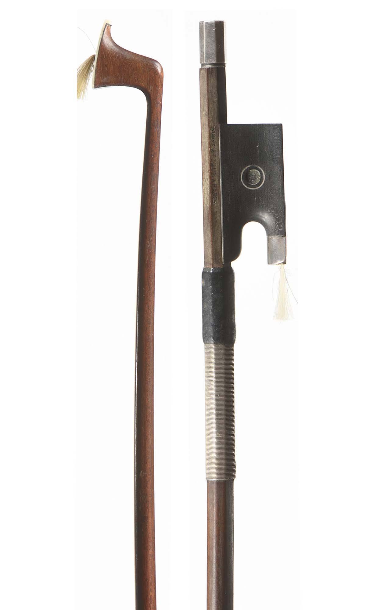 dont il porte la marque au fer "Vtor Fetique à Paris". Baguette ronde en beau bois de pernambouc. Hausse ébène avec oeil Parisien. Bouton en argent plein. 57 g sans mèche. 732 mm.