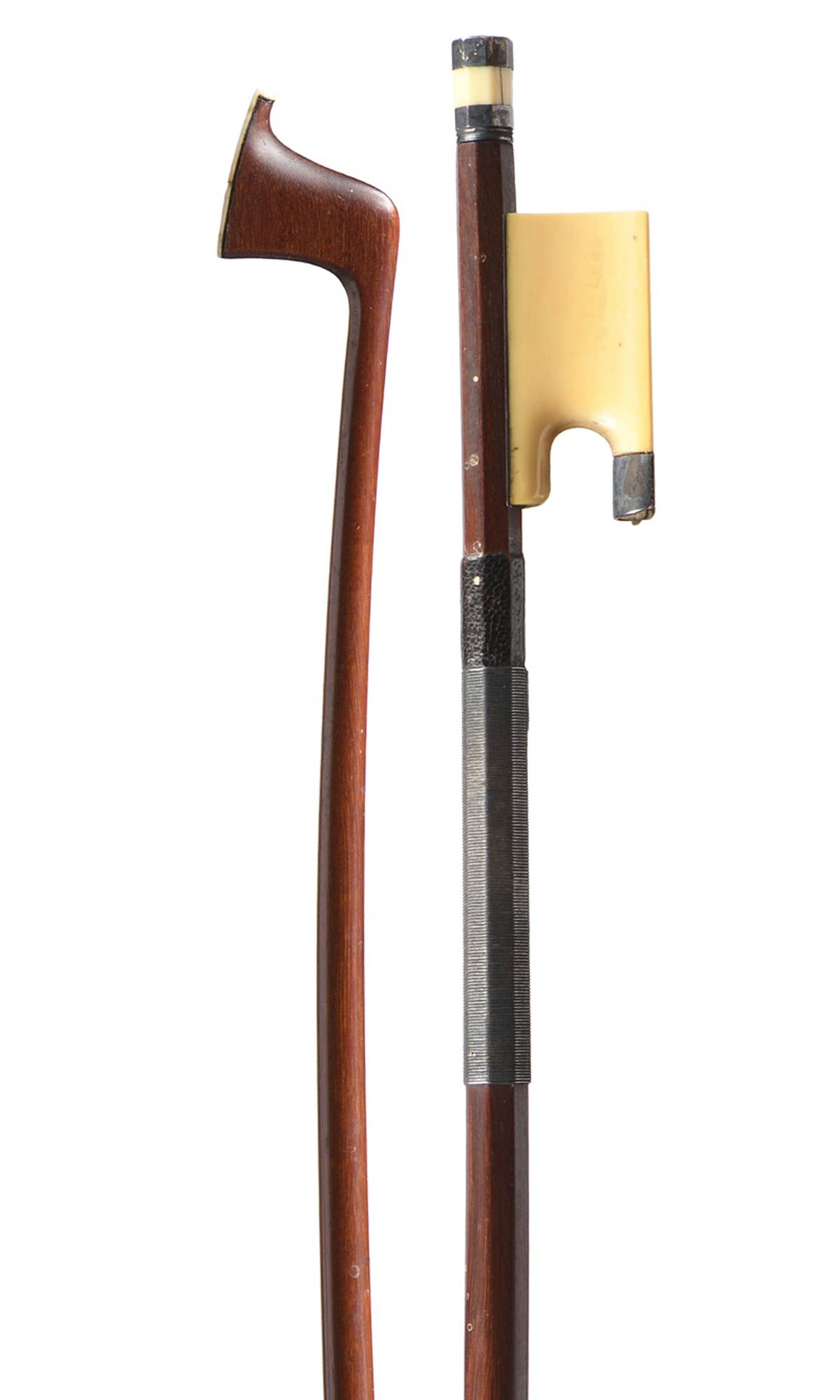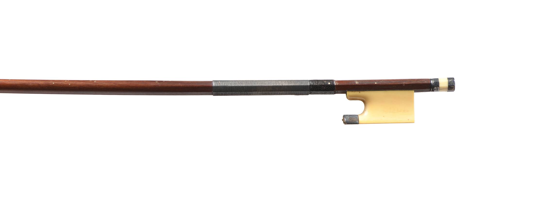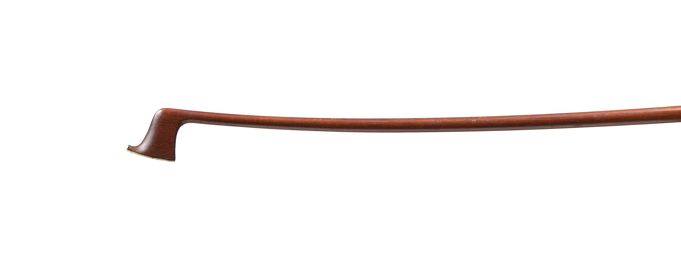 Intéressant archet de violon 1/2 portant la marque au fer "PAUL JOMBAR A PARIS". Baguette ronde en bois de pernambouc. Hausse ivoire monté argent. Bouton Argent Ivoire.