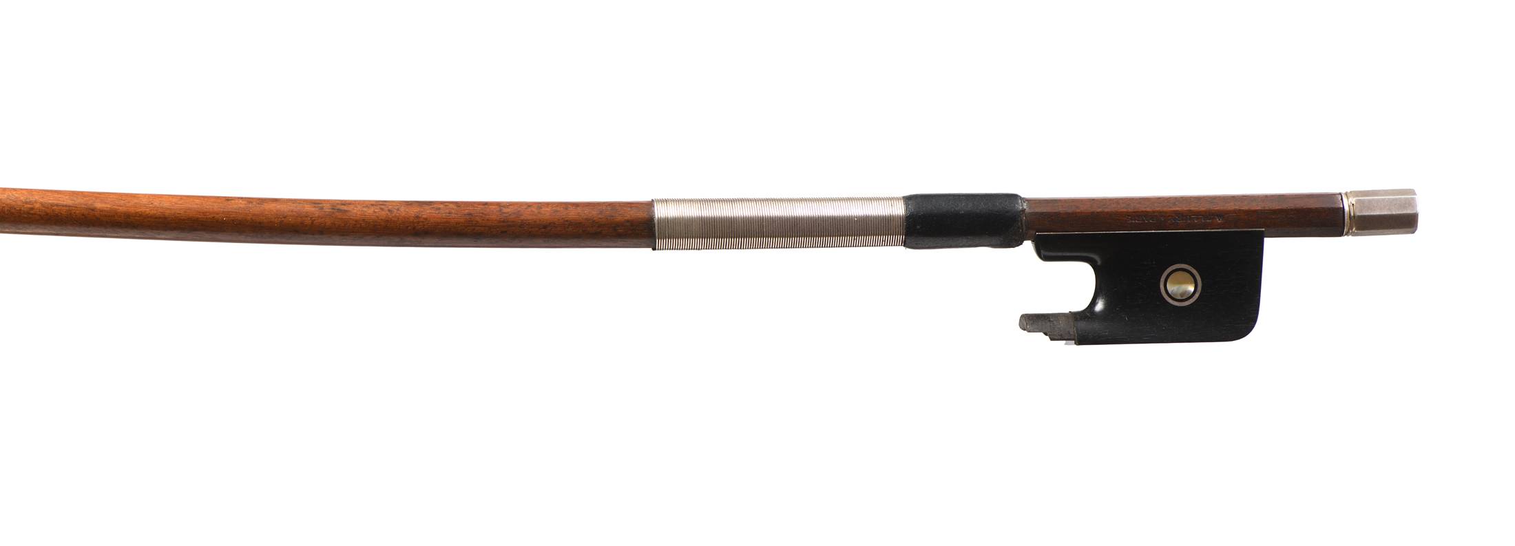 Baguette probablement de FLEURY, vers 1938, portant une marque au fer "A FLEURY A PARIS". Baguette ronde en bois de pernambouc. Hausse d'un autre auteur.