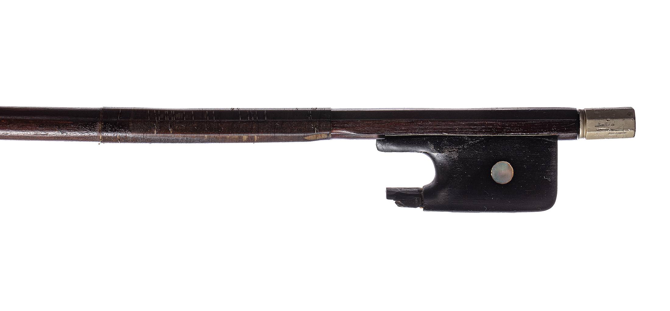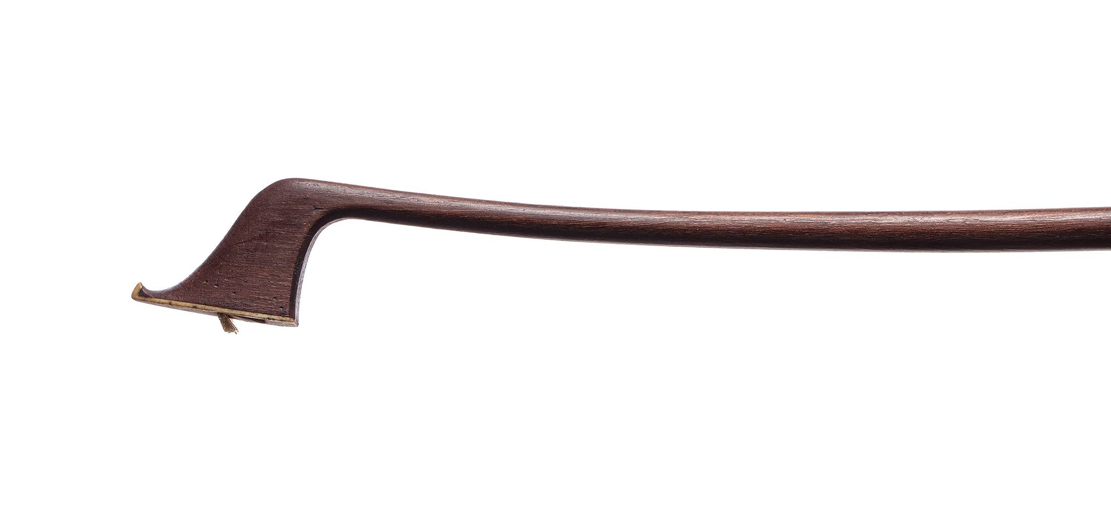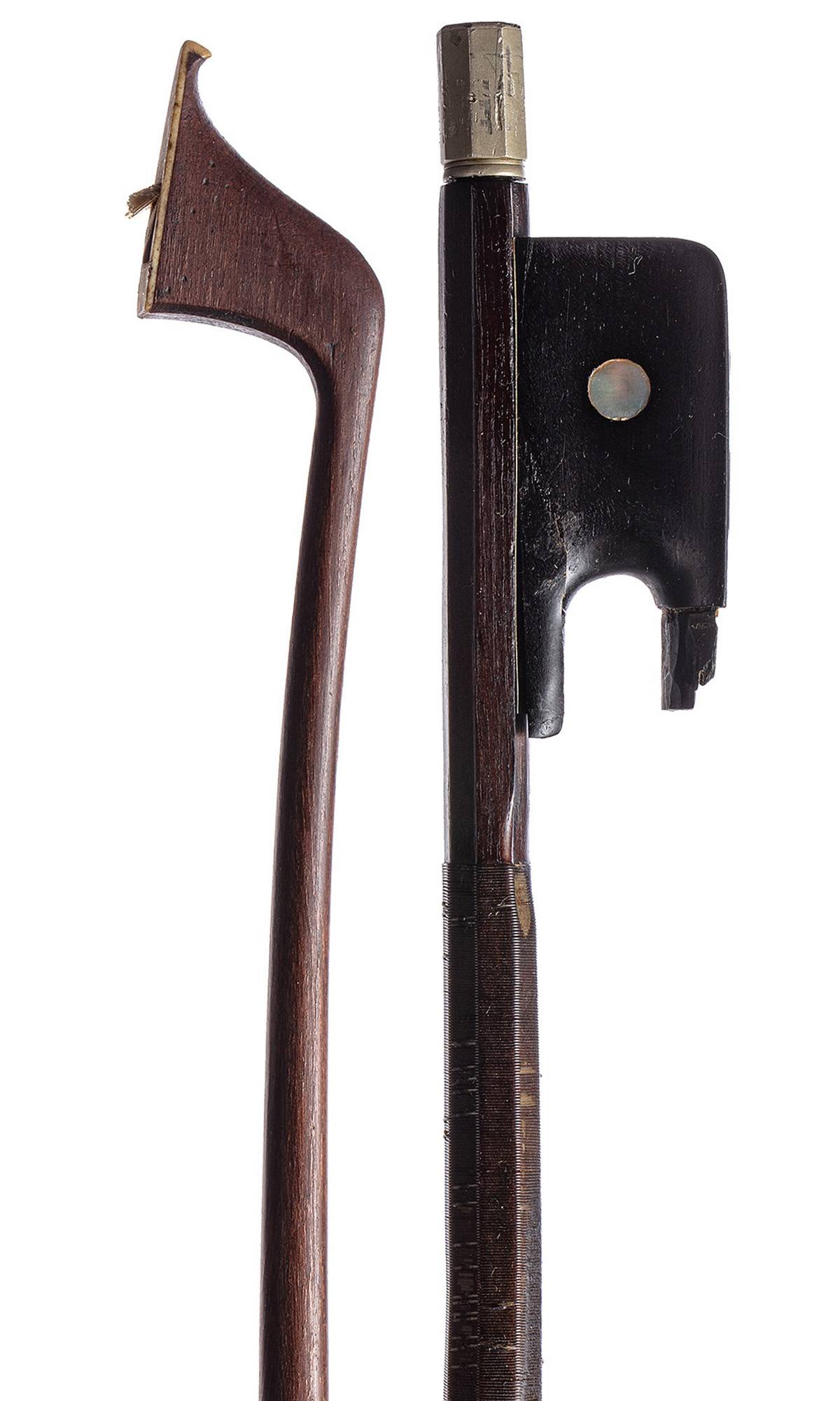 Baguette ronde en bois d'abeille. Hausse ébène montée maillechort. A restaurer. Manque le passant. 699 mm. 68 g sans mèche.