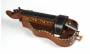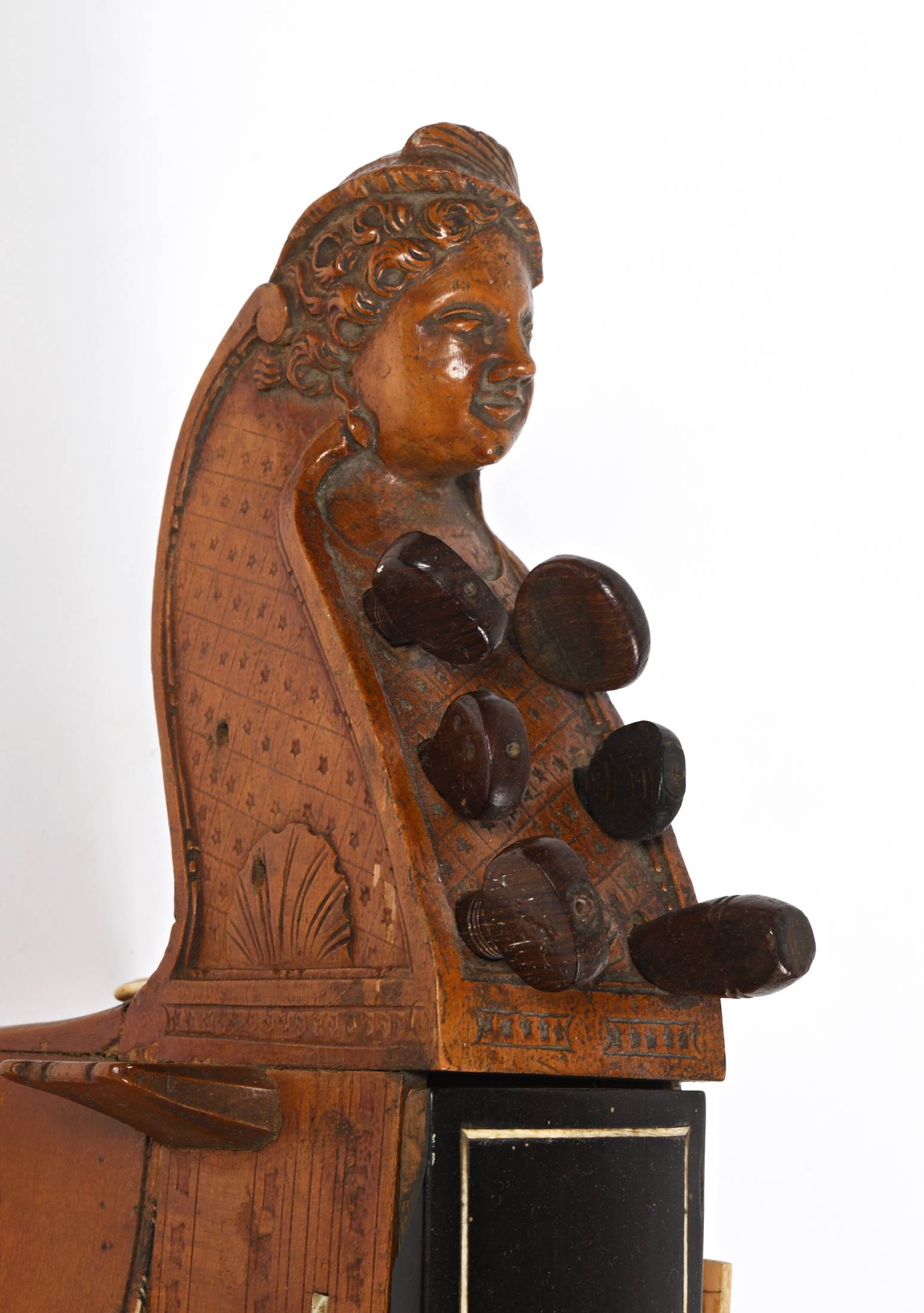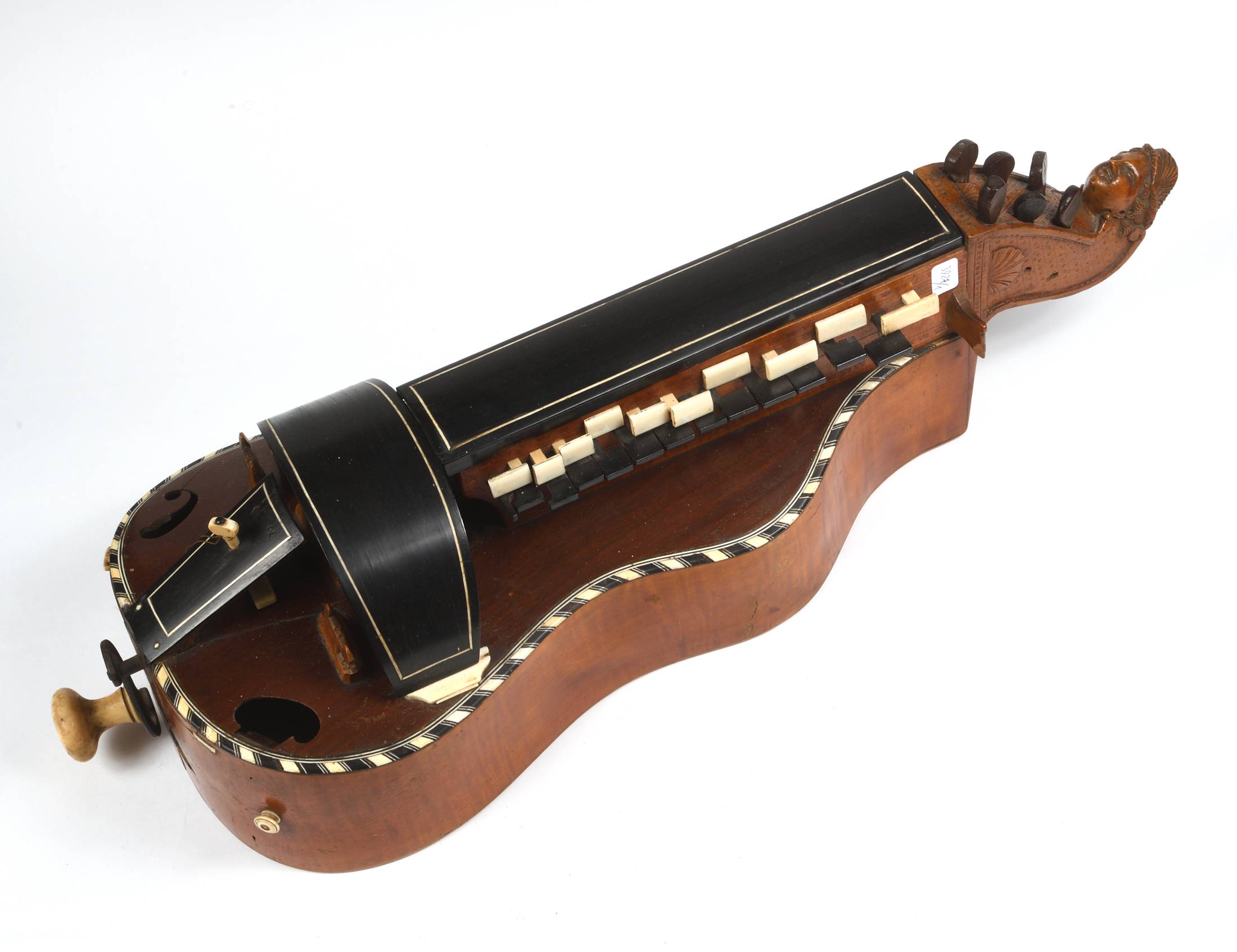 Belle vielle à roue à fond plat dans le style de COLSON. Tête sculptée d'une femme au chapeau, petites étoiles et coquilles saint jacques. Les bords sont incrustés d'ébène et ivoire. Signature manuscrite sous le couvercle " Charmoy lutie de Me la Contesse demeurs rue ... bertin, pres les?...". Diverses cassures et manques. A restaurer.