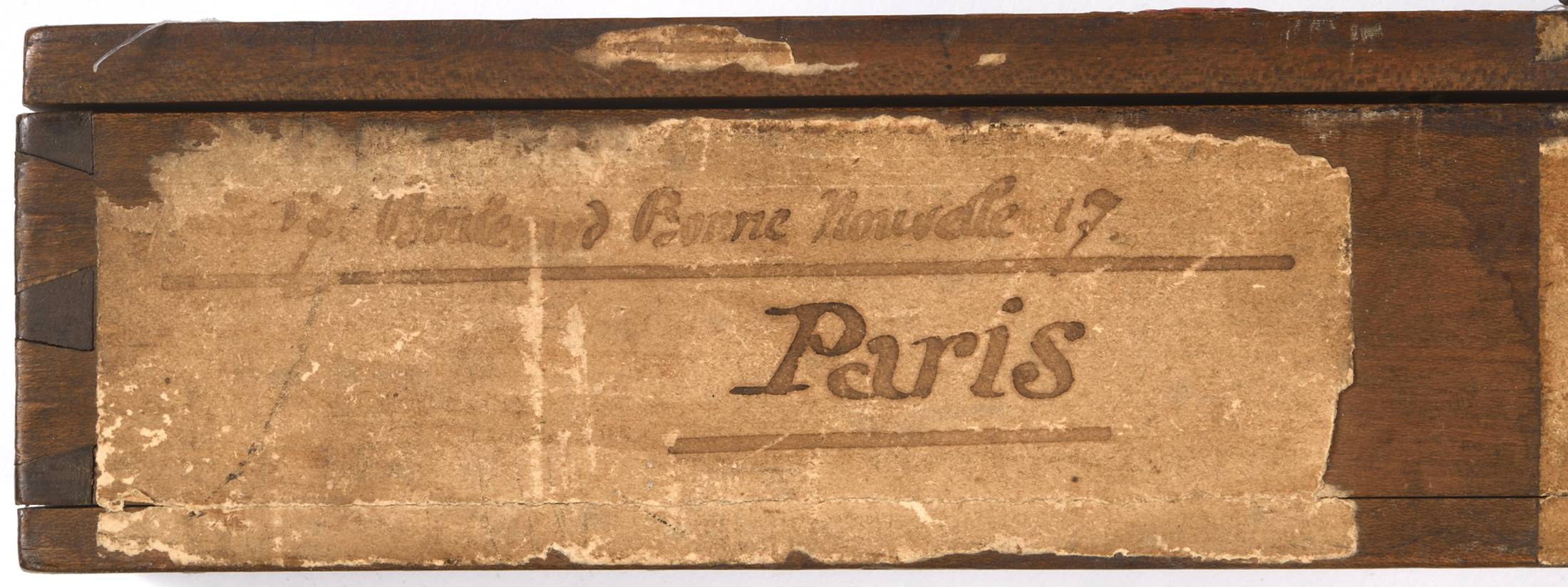 Boite ancienne d'archet portant différentes étiquettes de l'époque. 77,3 x 6 x 5 cm