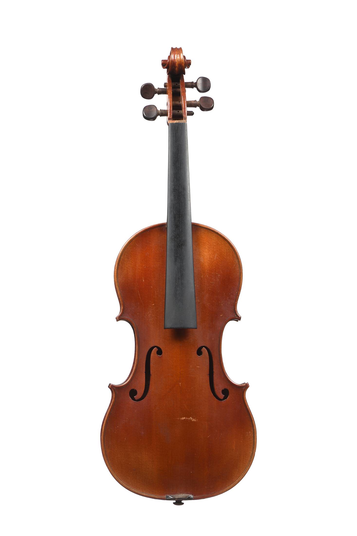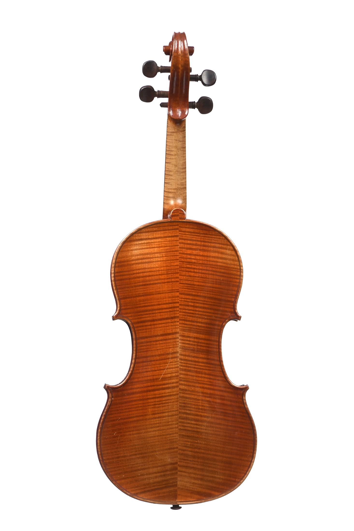 portant une étiquette "Copie de Jacobus Stainer...". Fond de deux pièces en bel érable aux ondes fines. Vernis brun orangé sur fond doré. 356 mm.