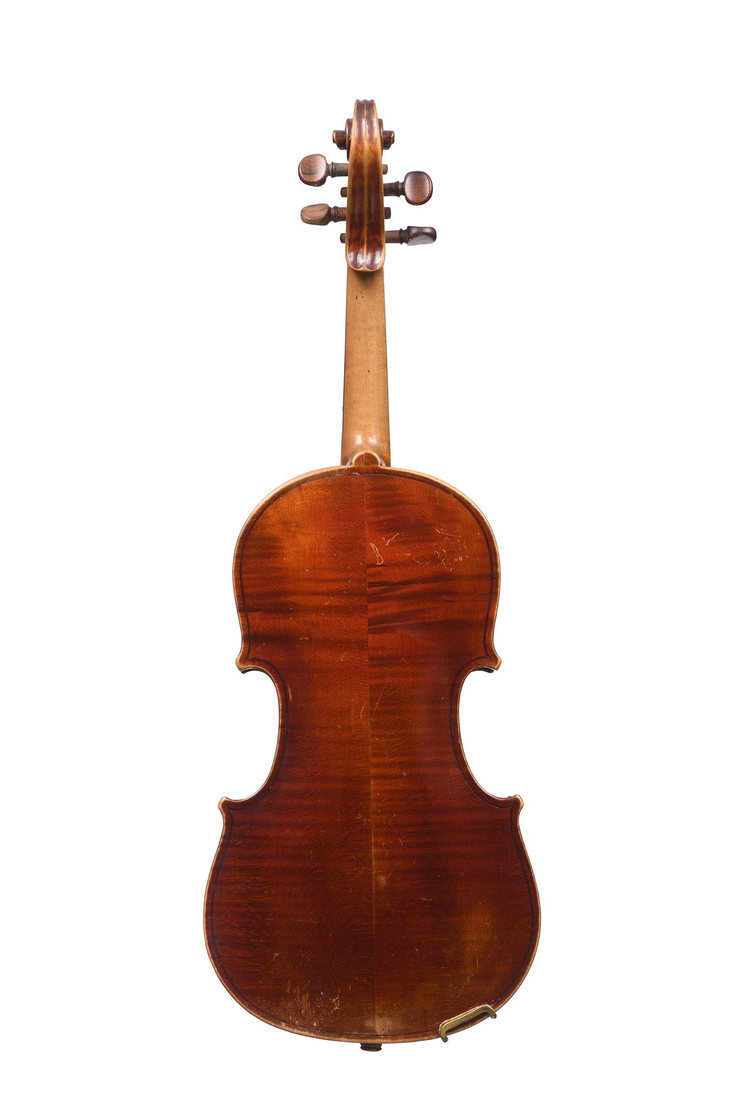 Fond de deux pièces en érable. Vernis brun rouge. Cassures de table. Avec boite et archet d'étude. 351 mm.