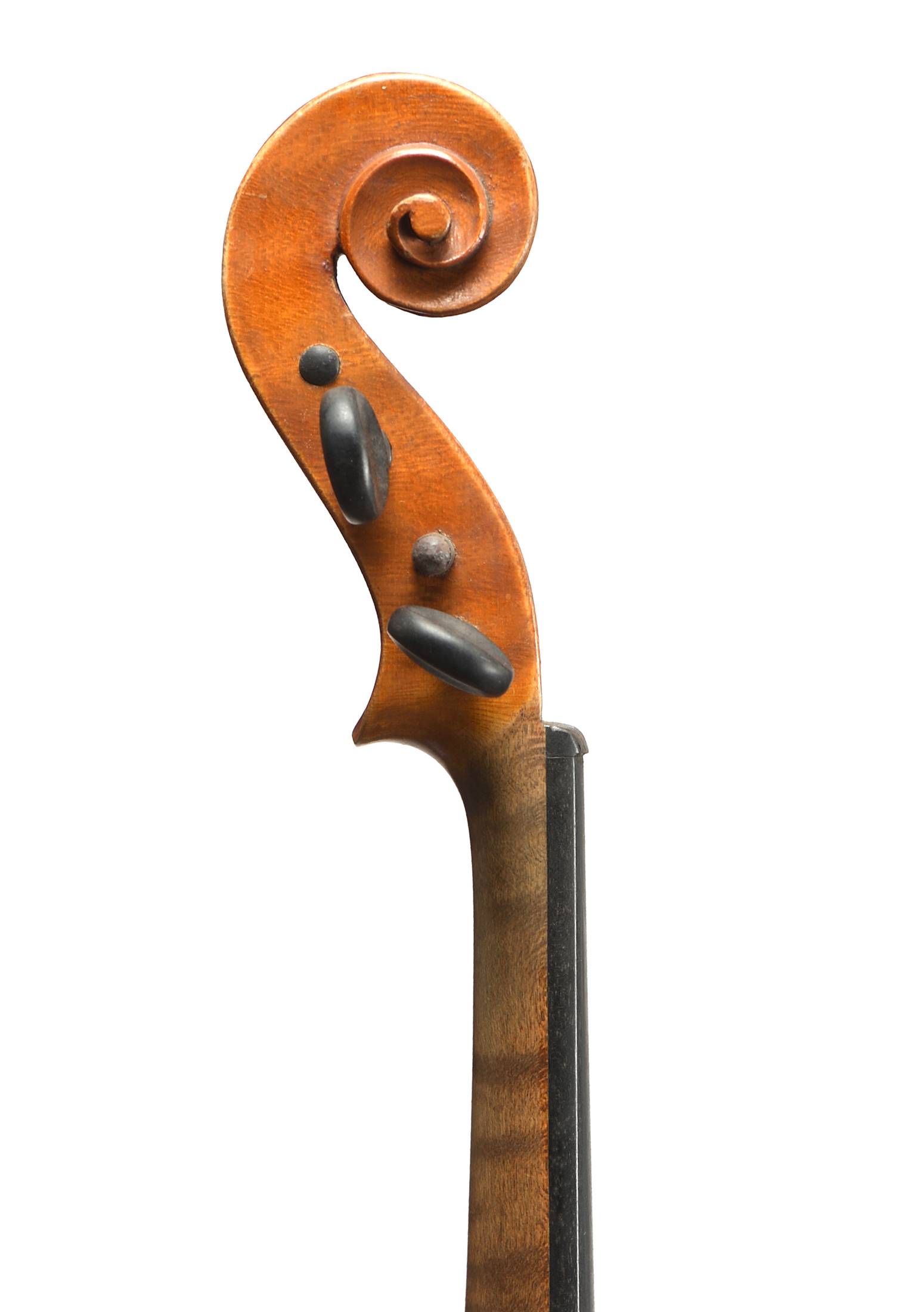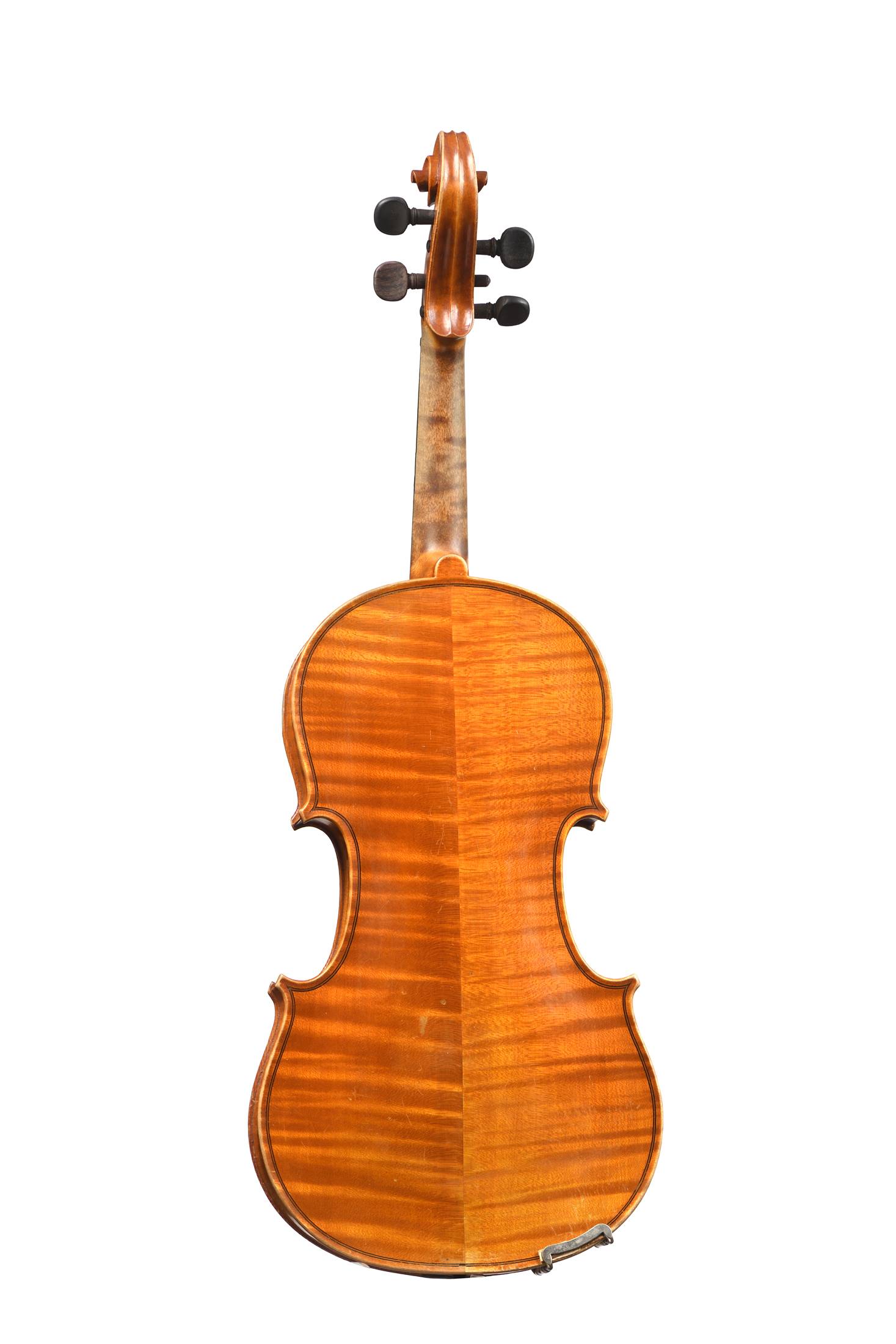 Fond de deux pièces en bel érable. Vernis brun doré. 360 mm. Avec boite et archet.