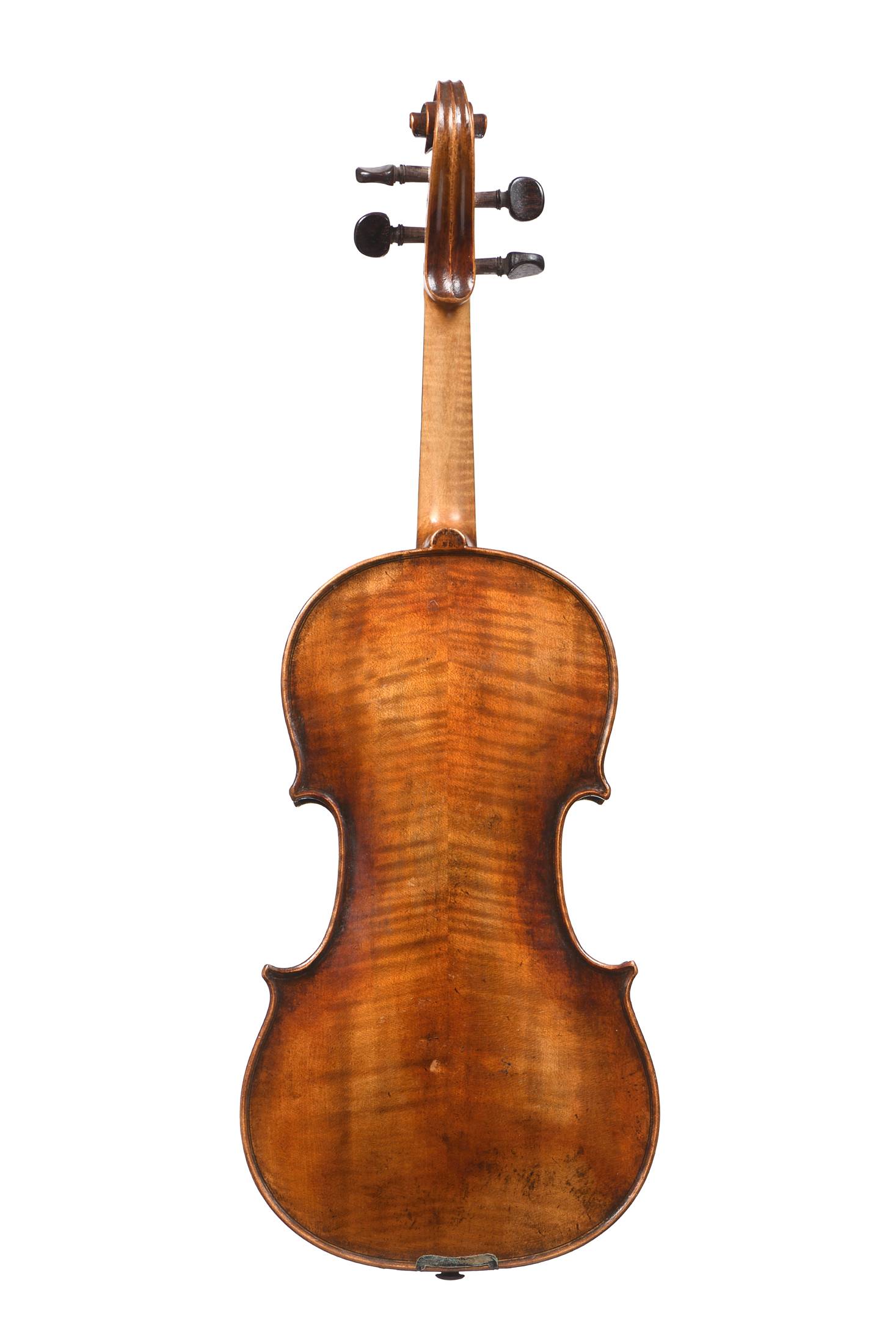 portant une étiquette " Acoulon" et une marque au fer sur le talon du manche "SARASATE EL". Fond de deux pièces en érable. Vernis brun rouge sur fond doré. Avec boite et archet Mirecourt, Dent de requin et marque au fer TOURTE. 357 mm.