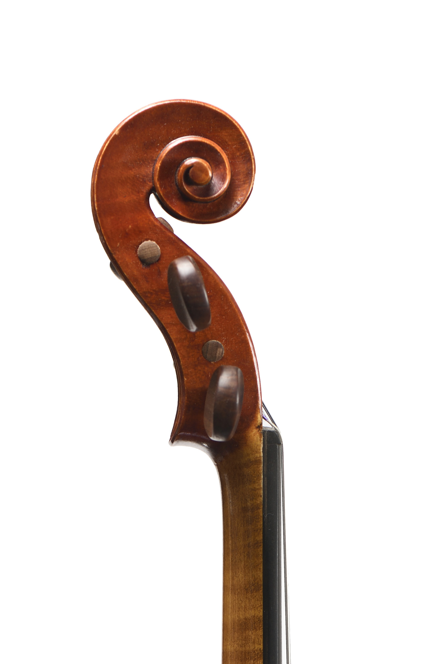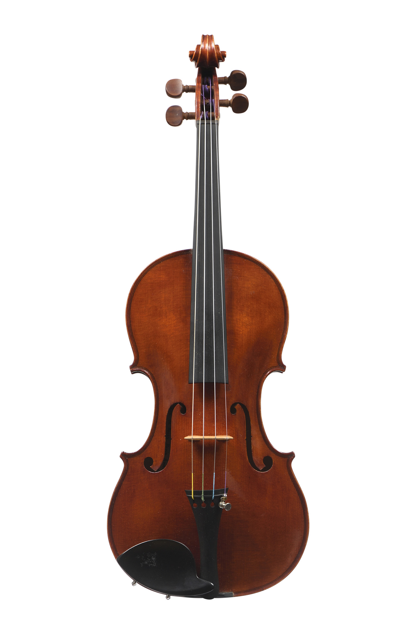dont il porte l'étiquette originale "Lucien L'humbert, luthier rue de passy. Année 1947... ainsi qu'une signature manuscrite "Fait par Lucien L'humbert... N°80." Fond de deux pièces en bel érable aux ondes légèrement descendantes. Vernis brun orangé sur fond doré. 358 mm