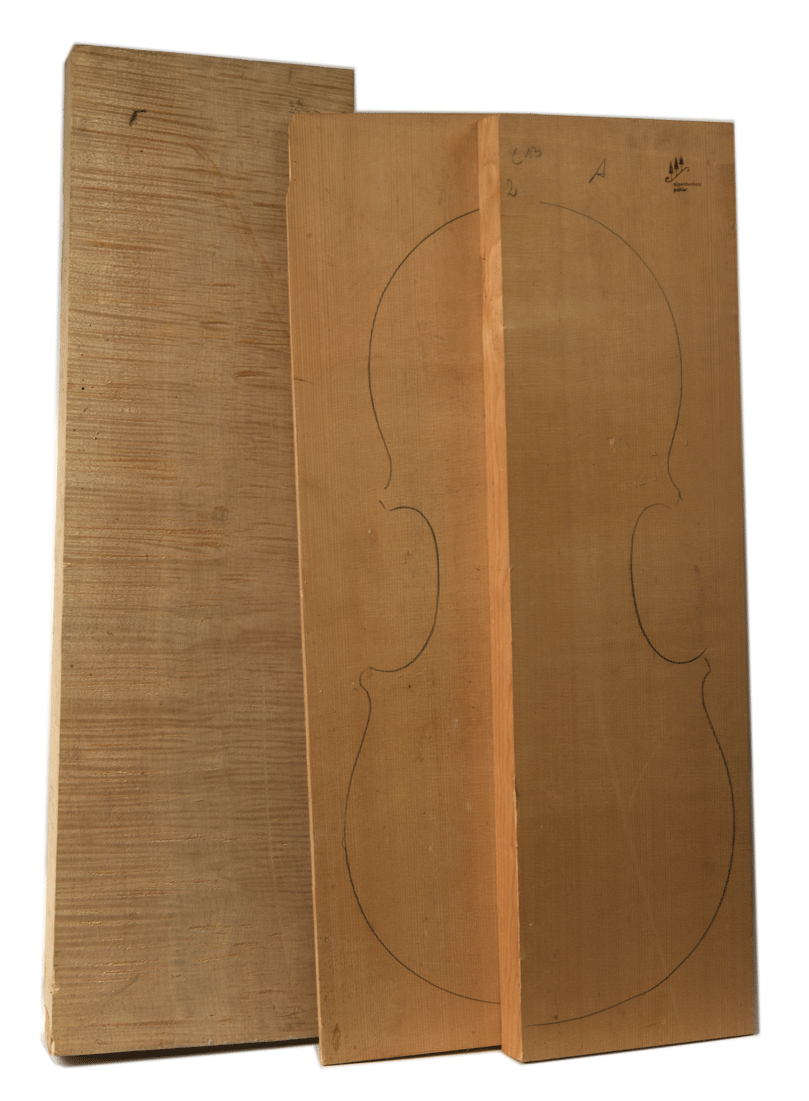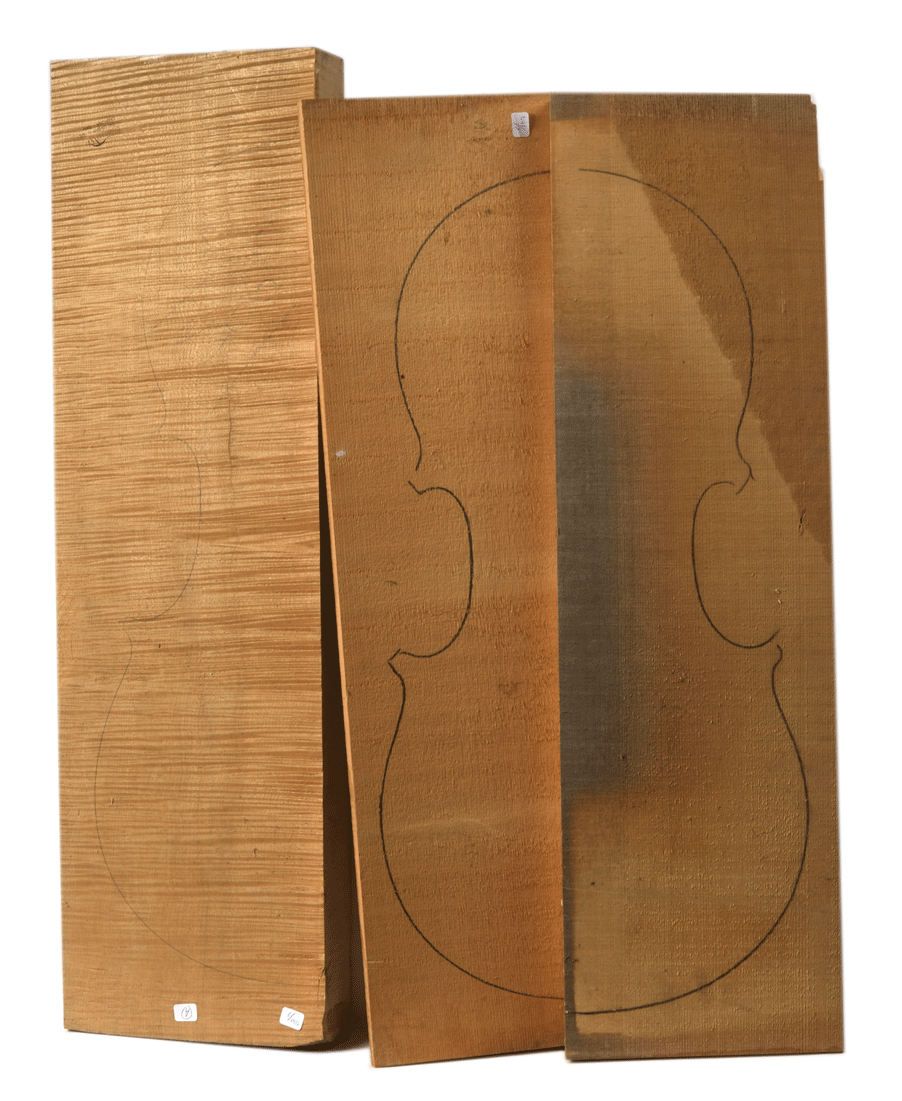 Un lot de bois de lutherie comprenant une table en épicéa et un fond en érable. Fond de violoncelle provenant de Crémone. Table provenant d'Allemagne "Alpentonholz pahler".