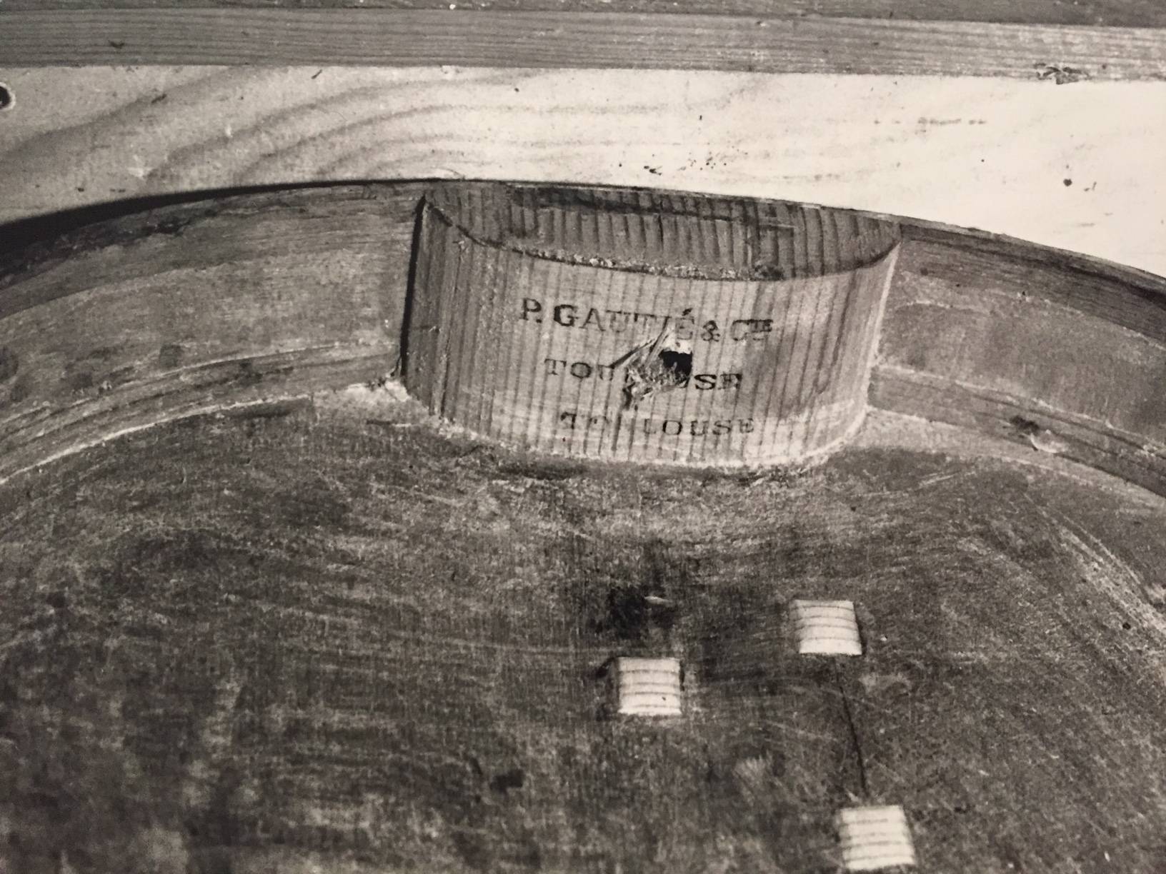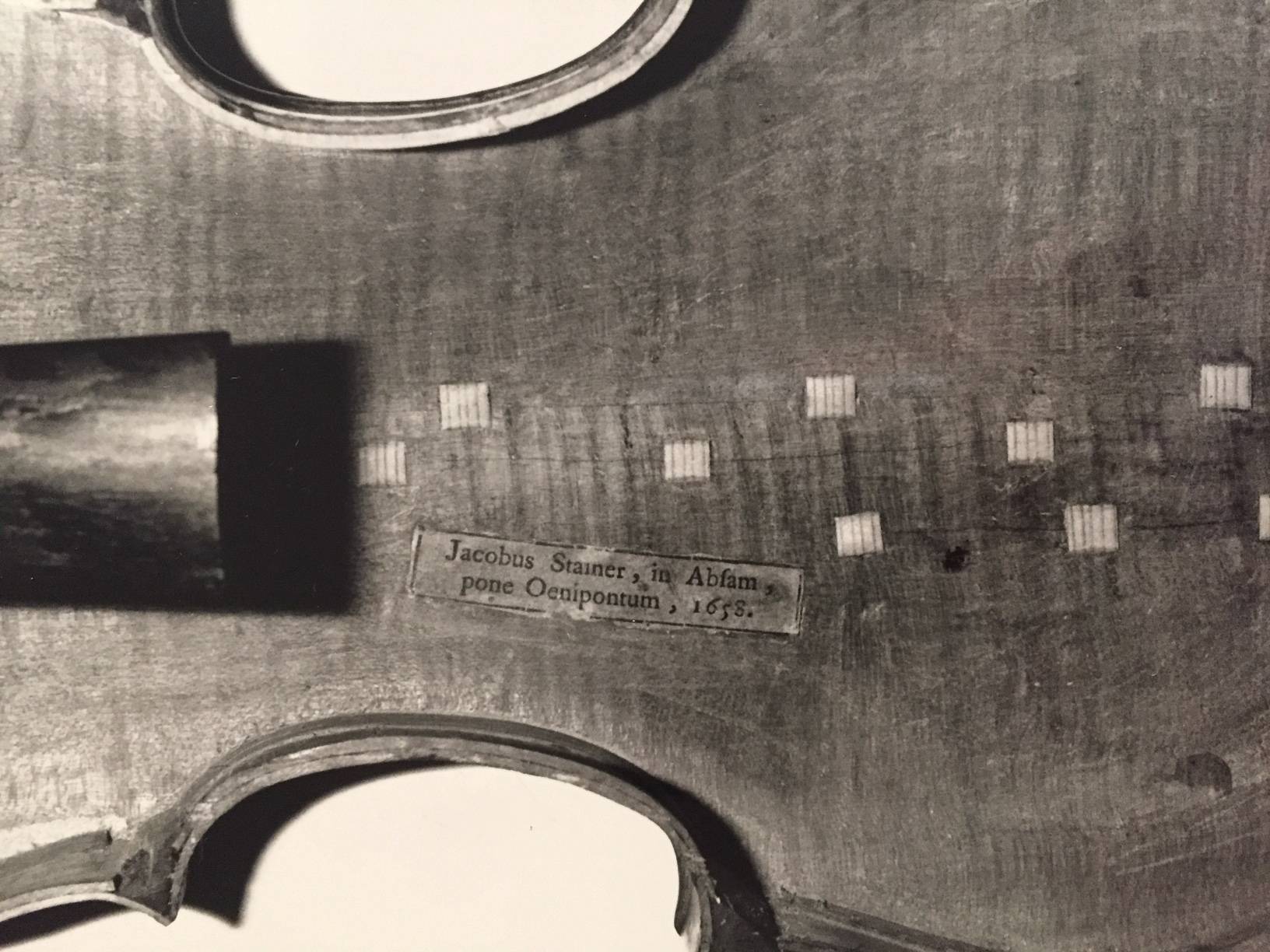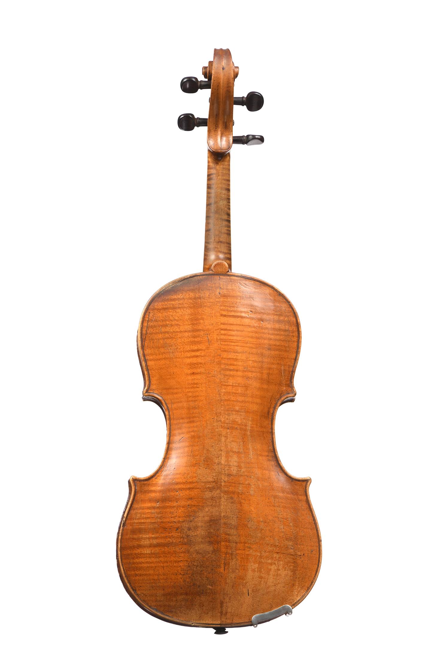 Beau violon Allemand fait au début du XIXe, portant une étiquette "Jacobus Stainer... 1658", réparé par GAUTIE... Fond de deux pièces en érable. Vernis brun doré. 363 mm.