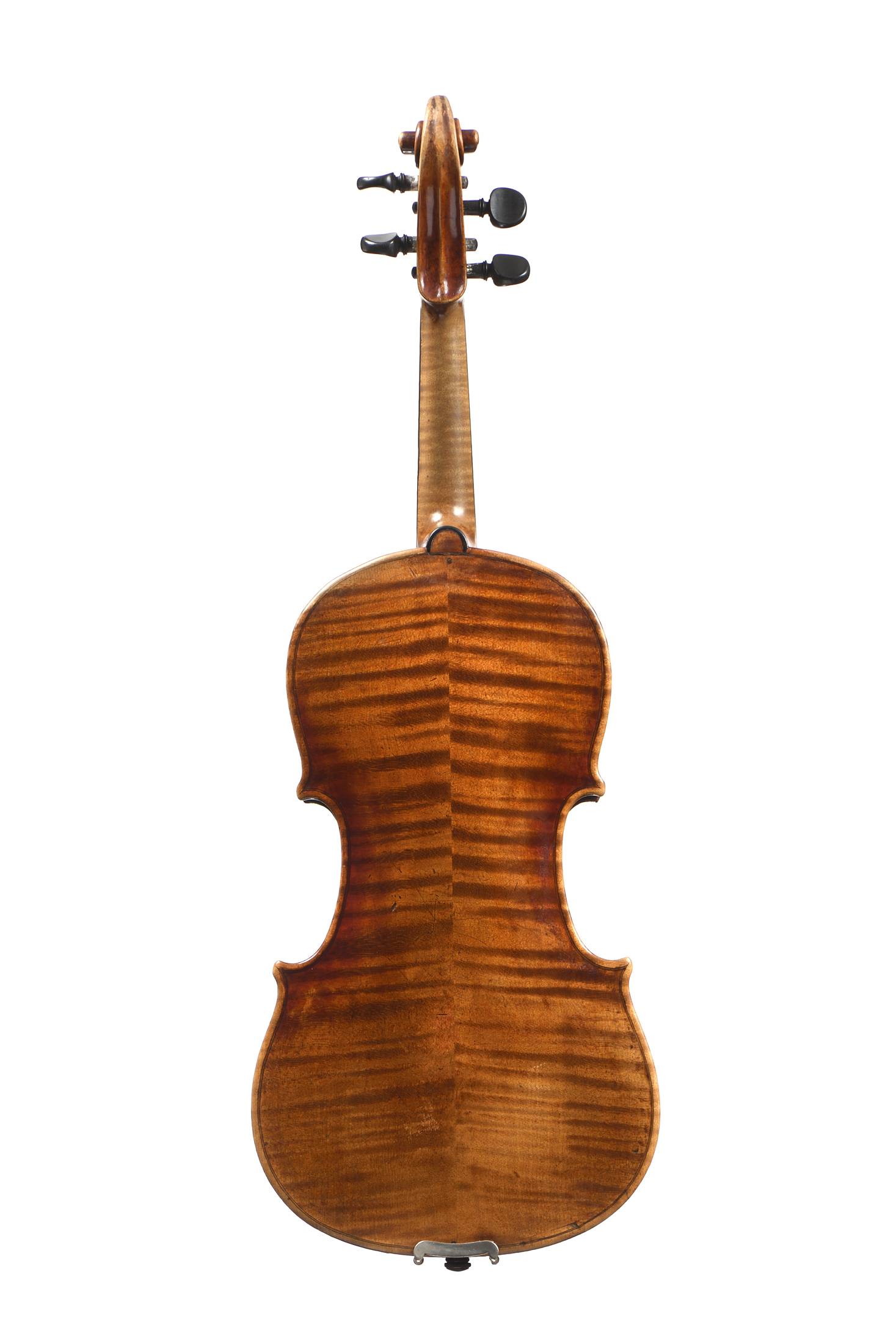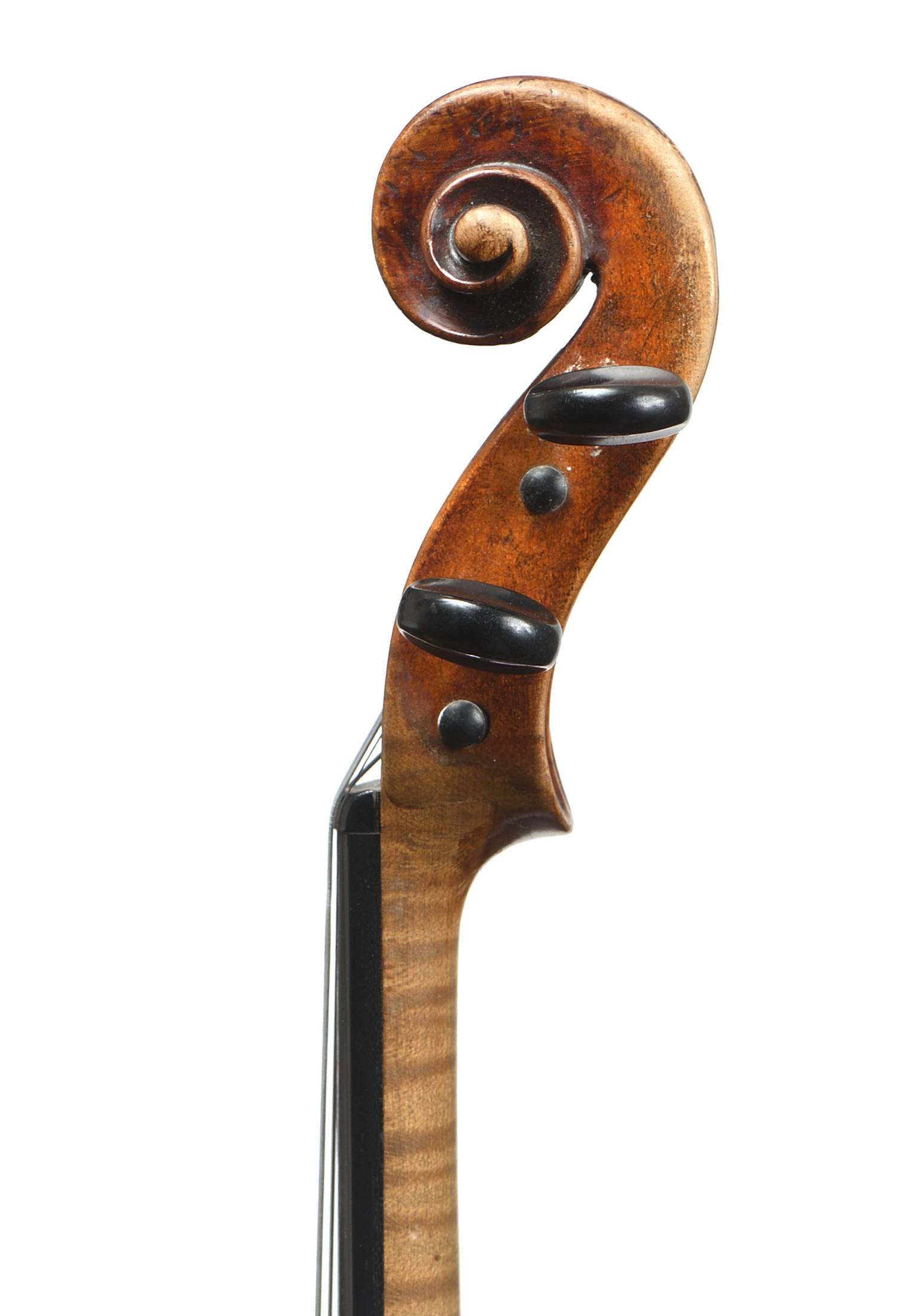 Intéressant violon XIXe. Beau fond de deux pièces en érable. Vernis brun rouge sur fond doré. Table en épicéa aux pores irréguliers. Diverses cassures de table.