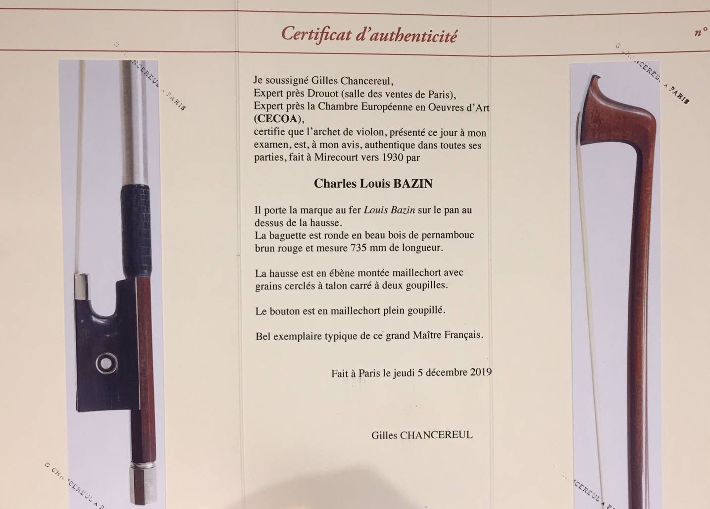 French violin bow by Charles Louis BAZIN. Gilles Chancereul's certificate.