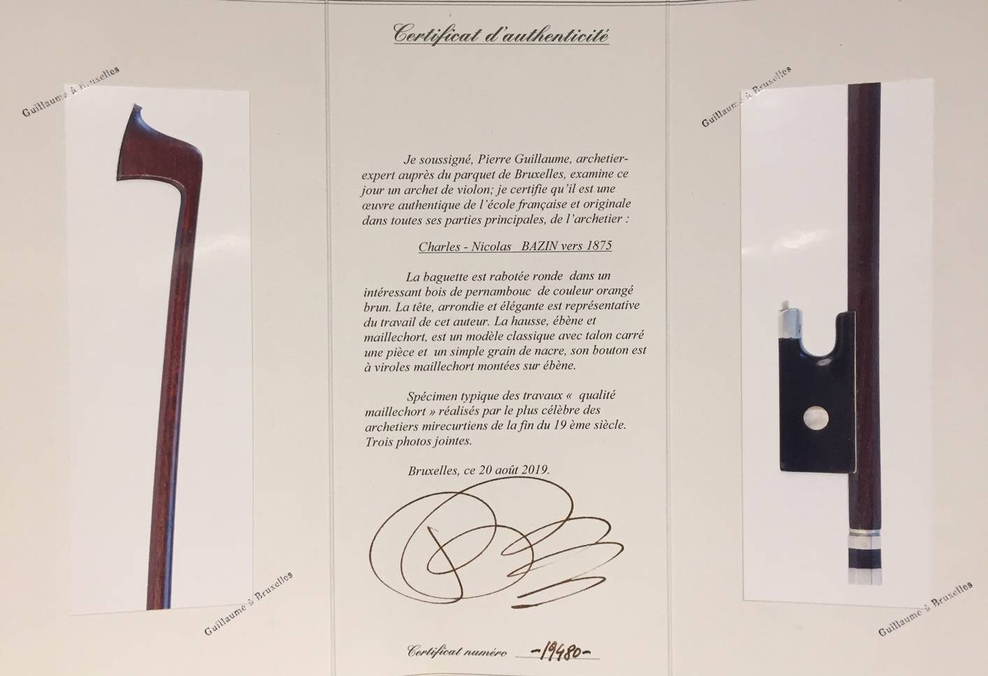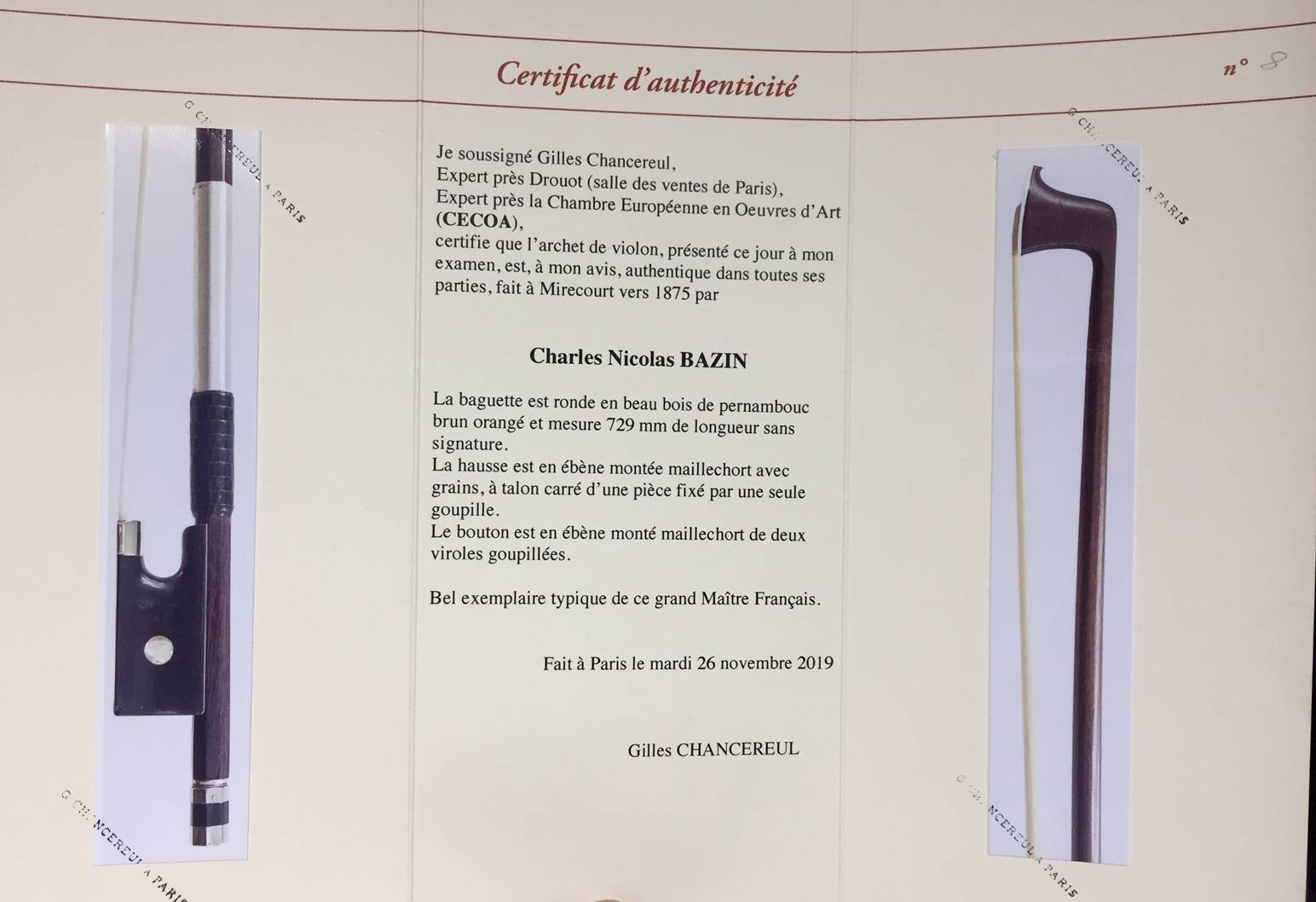 French violin bow by Charles Nicolas BAZIN. Two certificates.