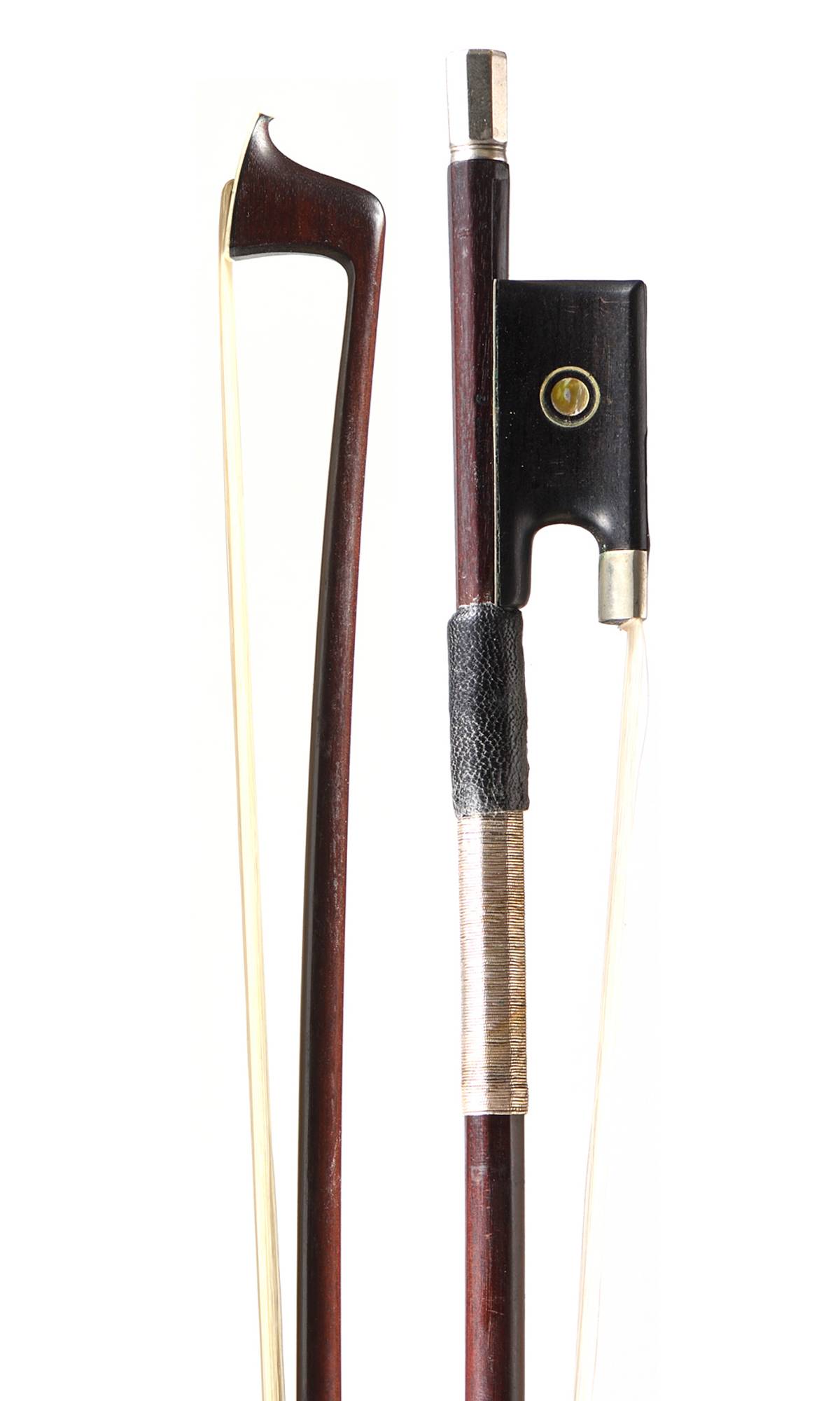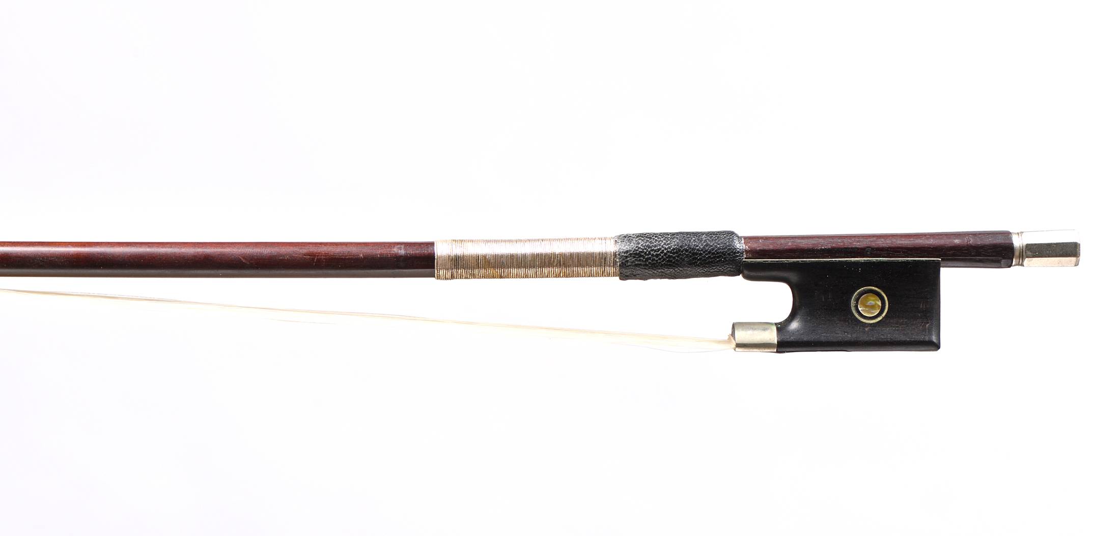 Fait à Mirecourt à la fin du XIXe, portant la marque au fer "J.DERAZEY". Baguette ronde en beau bois de pernambouc. Hausse Vuillaume en ébène, monté maillechort