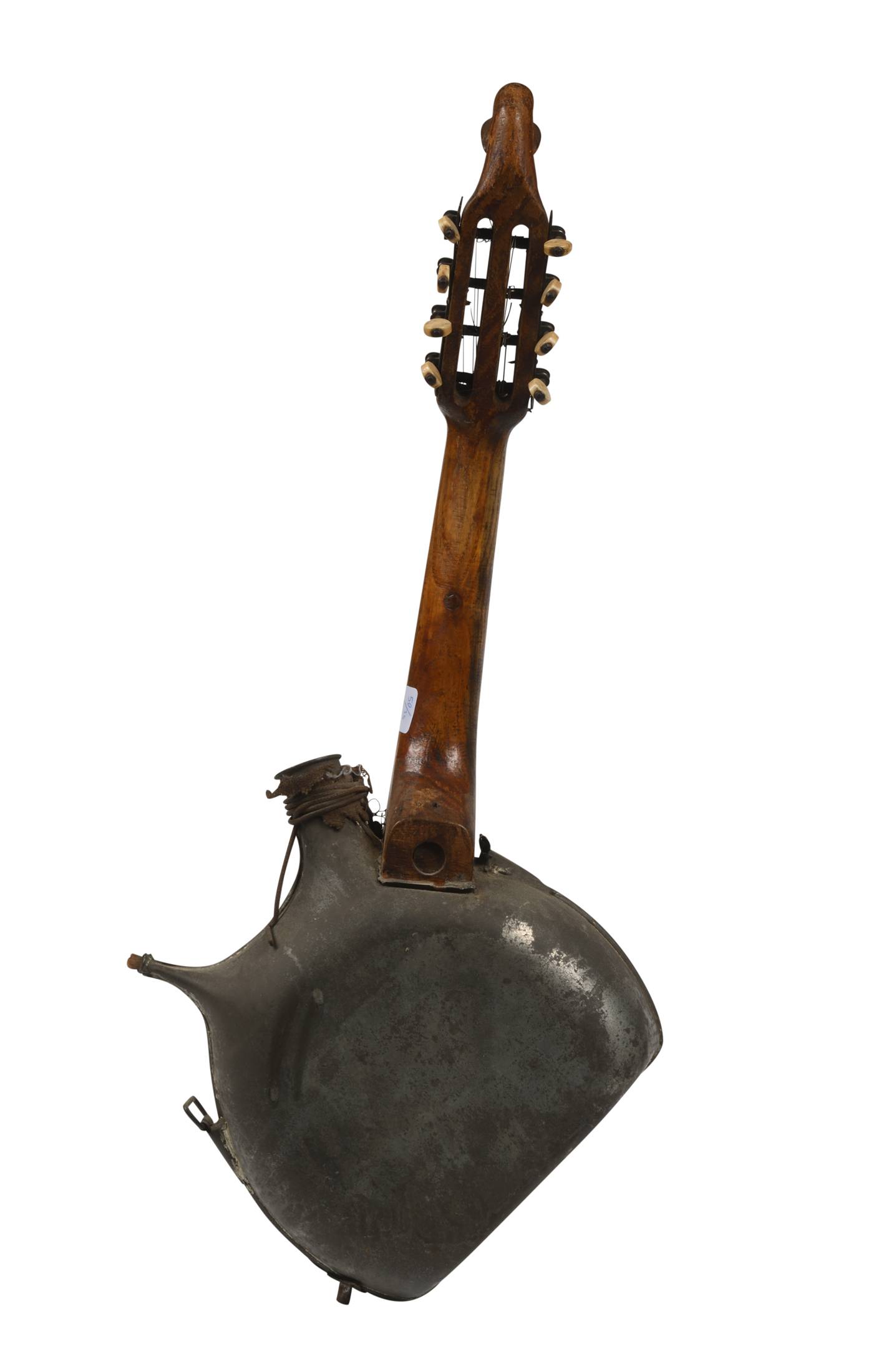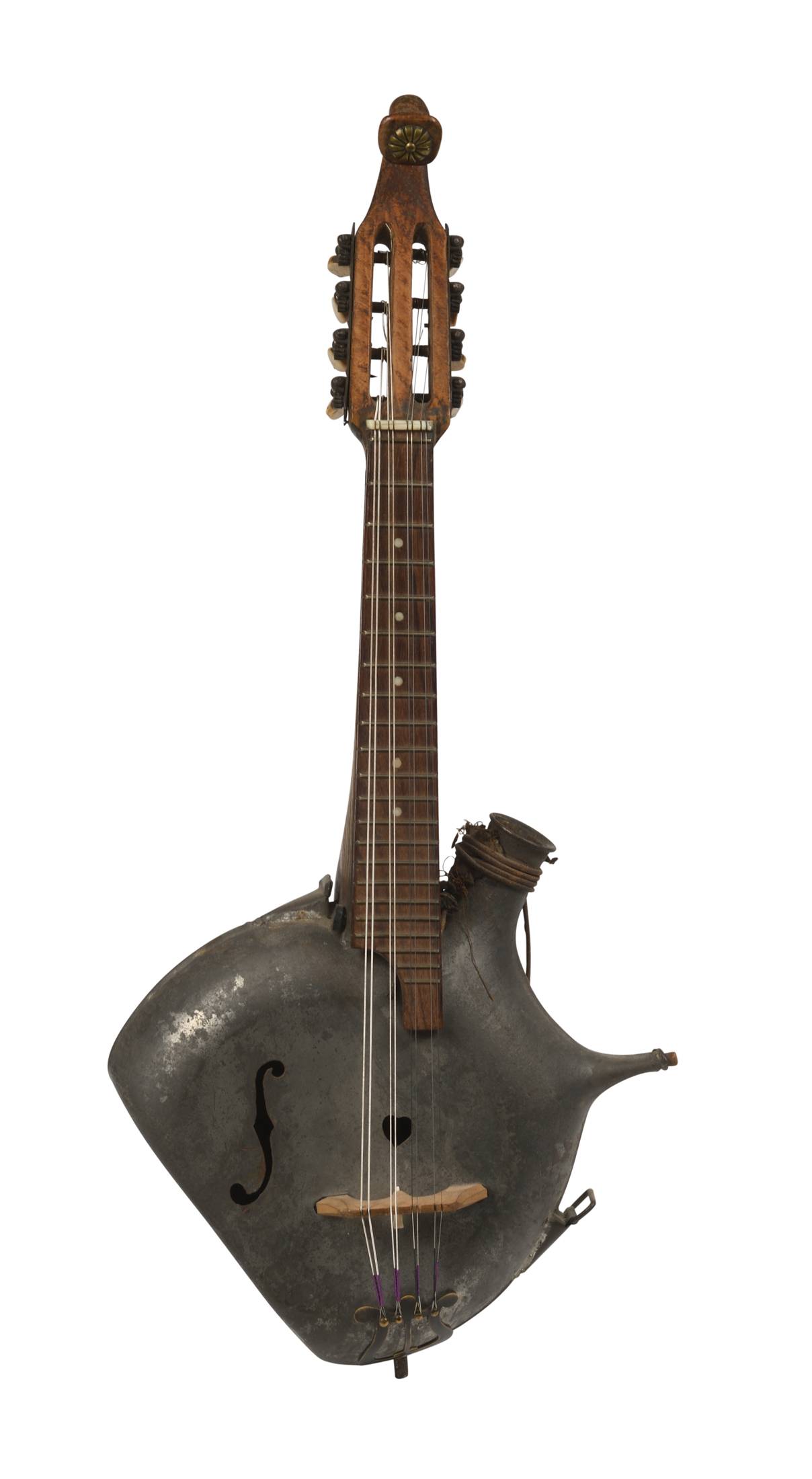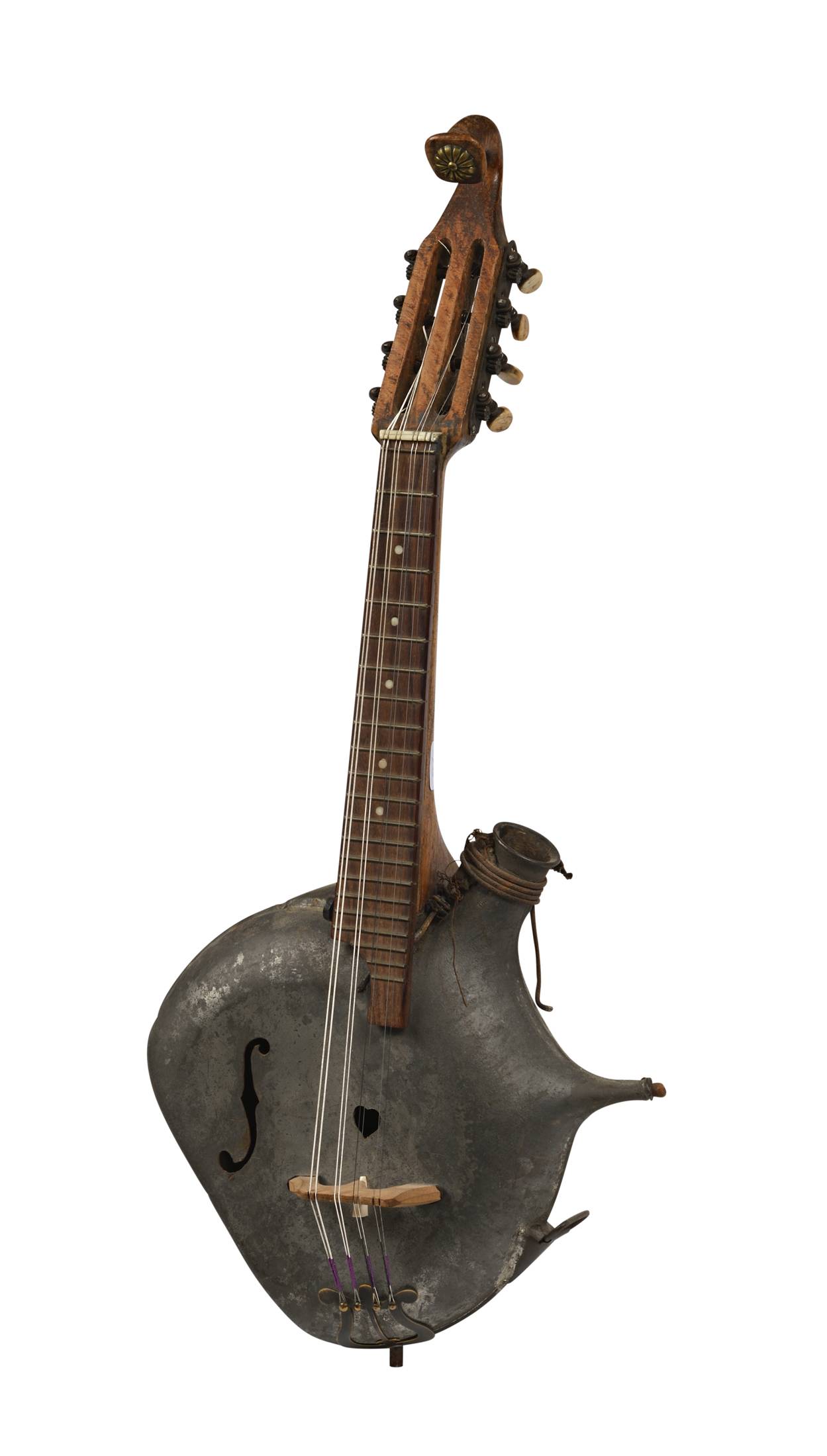 Rare gourde formant mandoline. La gourde est ajourée d'une ouie de violon et d'un coeur. 27 cm (Gourde)